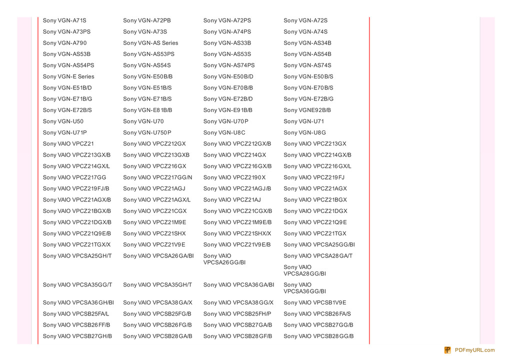 Sony VGN-A73S Sony VGN-A74PS Sony VGN-A74S Sony VGN-A790 Sony VGN-AS Series Sony VGN-AS33B Sony VGN-AS34B Sony VGN-AS53B Sony VGN-AS53PS Sony VGN-AS53S Sony VGN-AS54B Sony VGN-AS54PS Sony VGN-AS54S Sony VGN-AS74PS Sony VGN-AS74S Sony VGN-E Series Sony VGN-E50B/B Sony VGN-E50B/D Sony VGN-E50B/S Sony VGN-E51B/D Sony VGN-E51B/S Sony VGN-E70B/B Sony VGN-E70B/S Sony VGN-E71B/G Sony VGN-E71B/S Sony VGN-E72B/D Sony VGN-E72B/G Sony VGN-E72B/S Sony VGN-E81B/B Sony VGN-E91B/B Sony VGNE92B/B Sony VGN-U50 Sony VGN-U70 Sony VGN-U70P Sony VGN-U71 Sony VGN-U71P Sony VGN-U750P Sony VGN-U8C Sony VGN-U8G Sony VAIO VPCZ21 Sony VAIO VPCZ212GX Sony VAIO VPCZ212GX/B Sony VAIO VPCZ213GX Sony VAIO VPCZ213GX/B Sony VAIO VPCZ213GXB Sony VAIO VPCZ214GX Sony VAIO VPCZ214GX/B Sony VAIO VPCZ214GX/L Sony VAIO VPCZ216GX Sony VAIO VPCZ216GX/B Sony VAIO VPCZ216GX/L Sony VAIO VPCZ217GG Sony VAIO VPCZ217GG/N Sony VAIO VPCZ2190X Sony VAIO VPCZ219FJ Sony VAIO VPCZ219FJ/B Sony VAIO VPCZ21AGJ Sony VAIO VPCZ21AGJ/B Sony VAIO VPCZ21AGX Sony VAIO VPCZ21AGX/B Sony VAIO VPCZ21AGX/L Sony VAIO VPCZ21AJ Sony VAIO VPCZ21BGX Sony VAIO VPCZ21BGX/B Sony VAIO VPCZ21CGX Sony VAIO VPCZ21CGX/B Sony VAIO VPCZ21DGX Sony VAIO VPCZ21DGX/B Sony VAIO VPCZ21M9E Sony VAIO VPCZ21M9E/B Sony VAIO VPCZ21Q9E Sony VAIO VPCZ21Q9E/B Sony VAIO VPCZ21SHX Sony VAIO VPCZ21SHX/X Sony VAIO VPCZ21TGX Sony VAIO VPCZ21TGX/X Sony VAIO VPCZ21V9E Sony VAIO VPCZ21V9E/B Sony VAIO VPCSA25GG/BI Sony VAIO VPCSA25GH/T Sony VAIO VPCSA26GA/BI Sony VAIO VPCSA26GG/BI Sony VAIO VPCSA28GA/T Sony VAIO VPCSA28GG/BI Sony VAIO VPCSA35GG/T Sony VAIO VPCSA35GH/T Sony VAIO VPCSA36GA/BI Sony VAIO VPCSA36GG/BI Sony VAIO VPCSA36GH/BI Sony VAIO VPCSA38GA/X Sony VAIO VPCSA38GG/X Sony VAIO VPCSB1V9E Sony VAIO VPCSB25FA/L Sony VAIO VPCSB25FG/B Sony VAIO VPCSB25FH/P Sony VAIO VPCSB26FA/S Sony VAIO VPCSB26FF/B Sony VAIO VPCSB26FG/B Sony VAIO VPCSB27GA/B Sony VAIO VPCSB27GG/B Sony VAIO VPCSB27GH/B Sony VAIO VPCSB28GA/B Sony VAIO VPCSB28GF/B Sony VAIO VPCSB28GG/B PDFmyURL.com