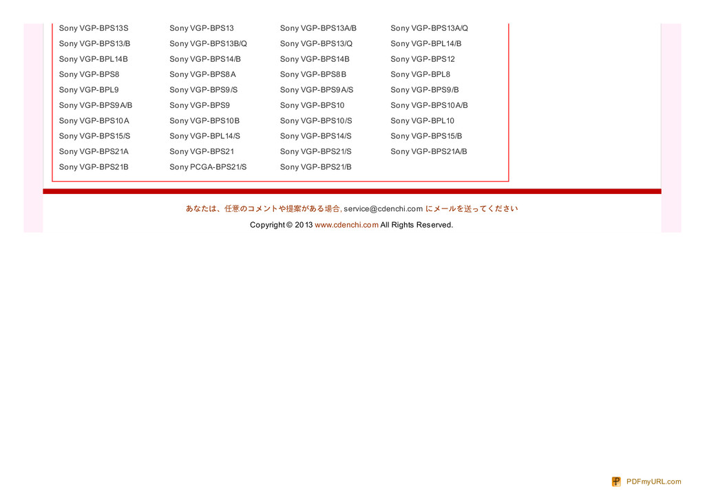 バッテリー Sony VGP-BPS13S バッテリー Sony VGP-BPS13/Q バッテリー Sony VGP-BPS21/S バッテリー Sony VGP-BPS9/S バッテリー Sony VGP-BPS13S バッテリー Sony VGP-BPS13/Q バッテリー 対応機種一覧: SONY VAIO VGN-TZ Series Sony VAIO VGN-UX Series Sony VAIO VGN-UX007 Sony VAIO VGN-UX1 Sony VAIO VGN-UX100 Sony VAIO VGN-UX180 Sony VAIO VGN-UX180P Sony VAIO VGN-UX1XN Sony VAIO VGN-UX280 Sony VAIO VGN-UX280P Sony VAIO VGN- UX280PK1 Sony VAIO VGN-UX380 Sony VAIO VGN-UX380N Sony VAIO VGN-UX390 Sony VAIO VGN-UX390N Sony VAIO VGN- UX490N/C Sony VAIO VGN-UX50 Sony VAIO VGN-UX71 Sony VAIO VGN-UX90 Sony VAIO VGN-UX90PS Sony VAIO VGN-UX90S Sony VAIO VGN-UX91 etc SONY VAIO VGN-G3 Series SONY VAIO VGN-G3KANB SONY VAIO VCC111 Chromebook Series SONY VAIO VCC-111 Chromebook Series SONY VAIO T Series SONY VAIO T11 Series SONY VAIO T13 Series SONY VAIO SVT-11 Series SONY VAIO SVT-13 Series SONY VAIO T Touchscreen Ultrabooks Series SONY VAIO T14 Touchscreen Ultrabooks Series SONY VAIO T15 Touchscreen Ultrabooks Series SONY VAIO SVT-14 Touchscreen Ultrabooks SONY VAIO SVT-15 Touchscreen Ultrabooks Sony VAIO VGN-P17H/W Sony VAIO VGN-P27H/G PDFmyURL.com
