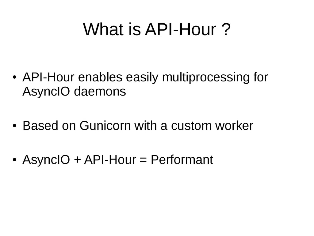 Benchmark (90+ Web stacks compared): https://www.techempower.com/benchmarks/ • Integrate API-Hour worker in Gunicorn • UDP support • Implement new server protocols for AsyncIO URL: http://www.api-hour.io/