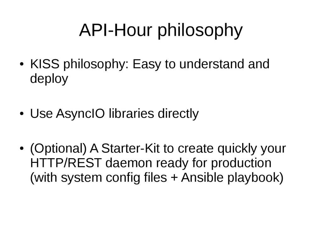 • Use AsyncIO libraries directly • (Optional) A Starter-Kit to create quickly your HTTP/REST daemon ready for production (with system config files + Ansible playbook)