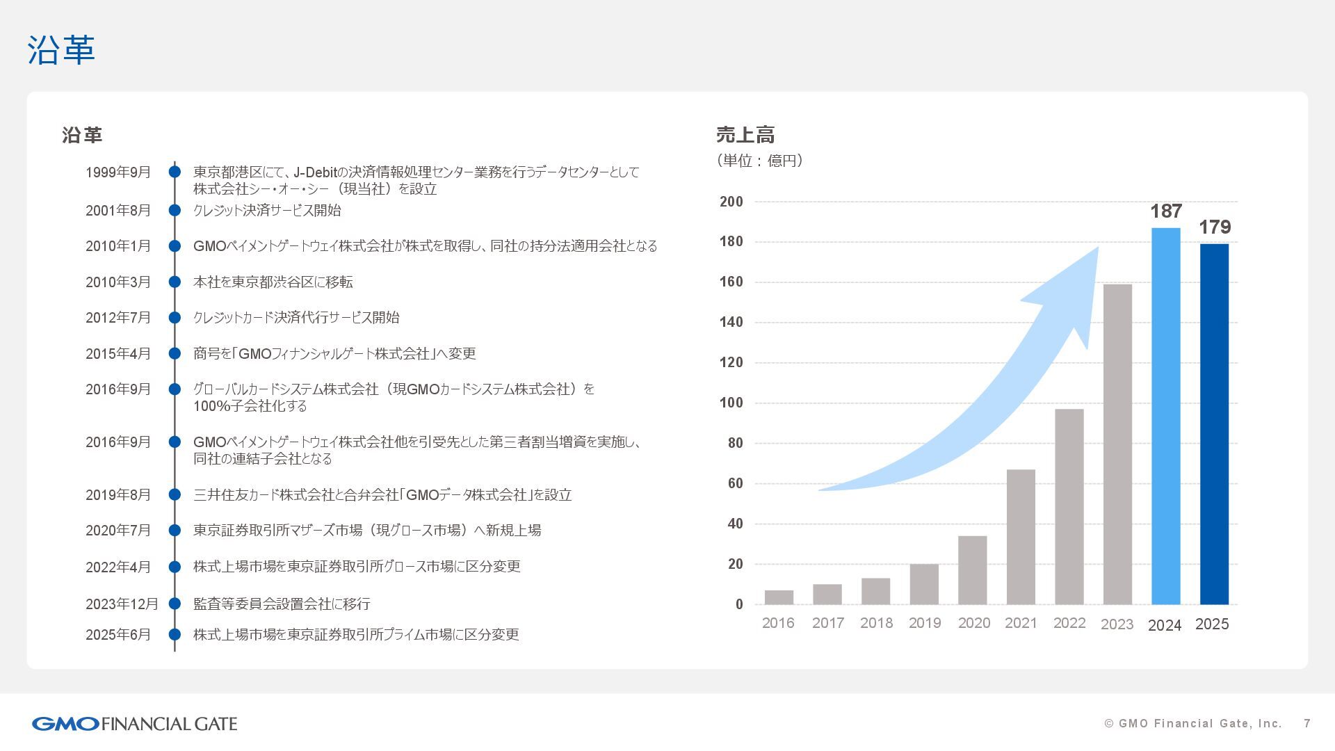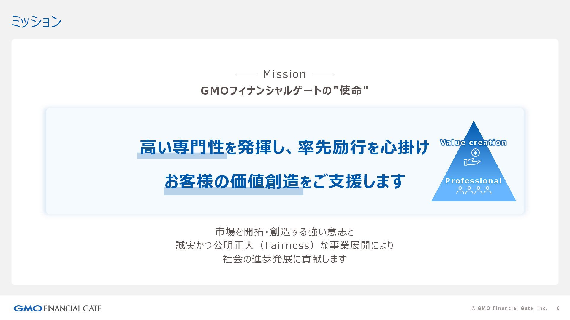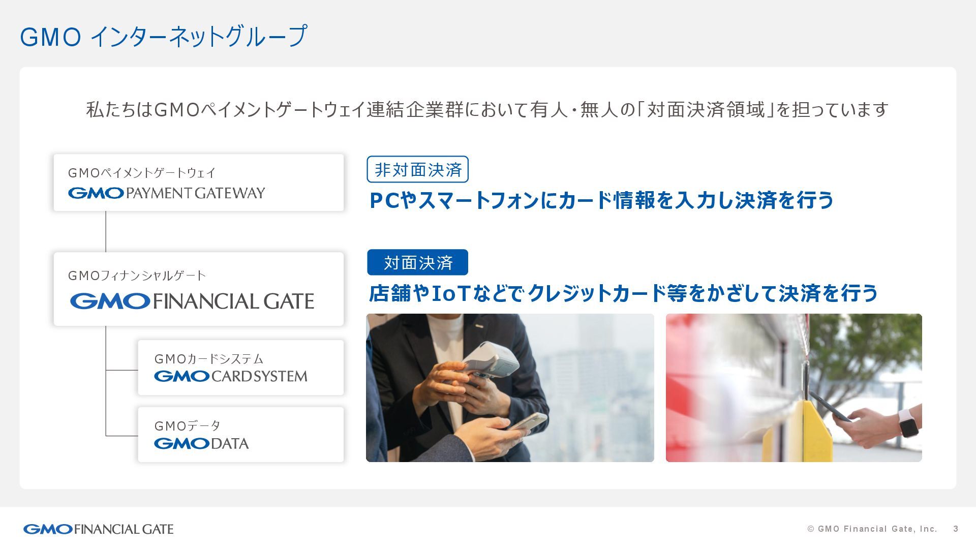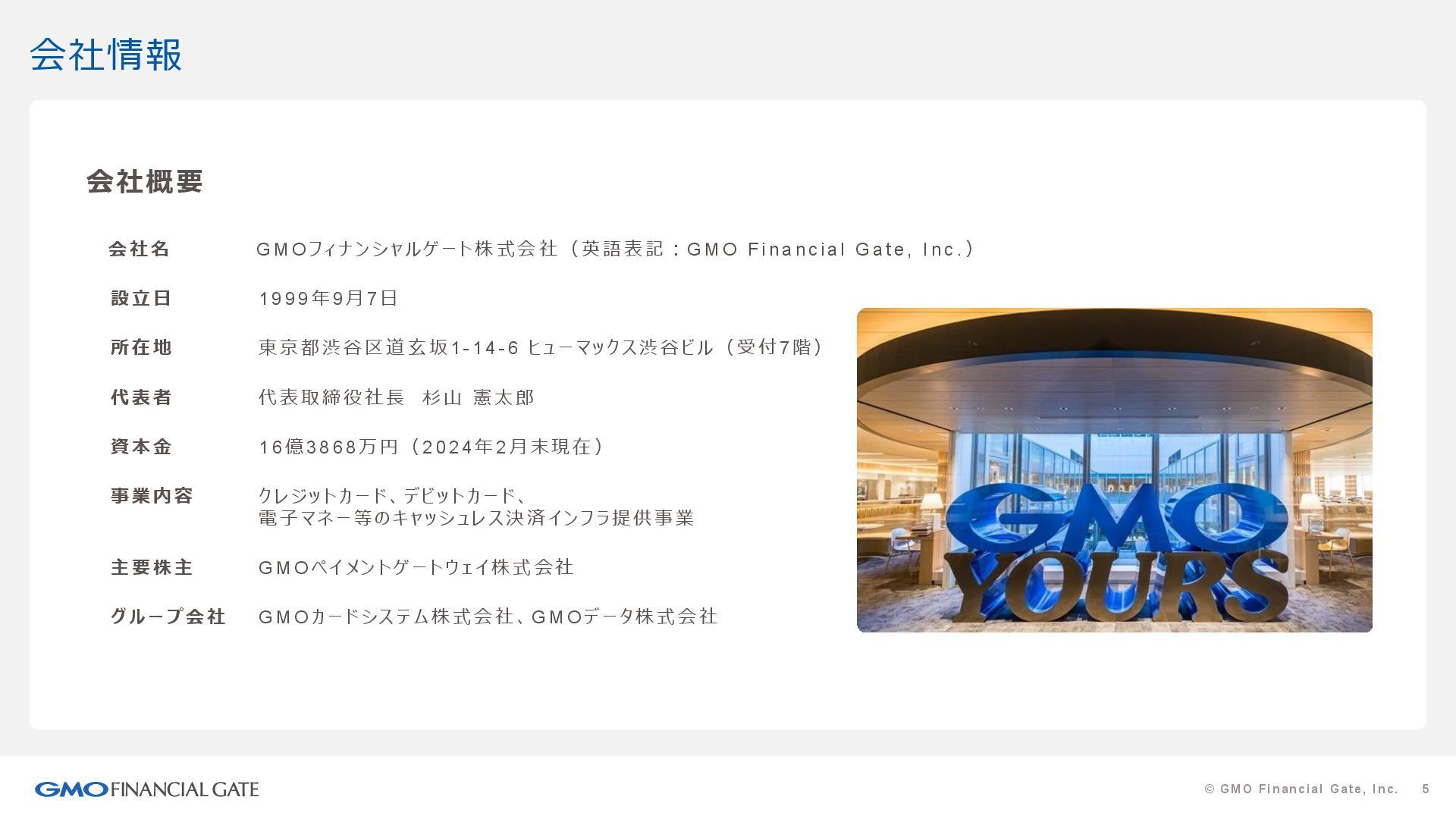 M O フ ィ ナ ン シ ャ ル ゲ ー ト 株 式 会 社 ( 英 語 表 記 : G M O F i n a n c i a l G a t e , I n c . ) 設 立 日 1 9 9 9 年 9 月 7 日 所 在 地 東 京 都 渋 谷 区 道 玄 坂 1 - 1 4 - 6 ヒ ュ ー マ ッ ク ス 渋 谷 ビ ル ( 受 付 7 階 ) 代 表 者 代 表 取 締 役 社 長 杉 山 憲 太 郎 資 本 金 1 6 億 3 8 6 8 万 円 ( 2 0 2 4 年 2 月 末 現 在 ) 事 業 内 容 ク レ ジ ッ ト カ ー ド 、 デ ビ ッ ト カ ー ド 、 電 子 マ ネ ー 等 の キ ャ ッ シ ュ レ ス 決 済 イ ン フ ラ 提 供 事 業 グ ル ー プ 会 社 G M O カ ー ド シ ス テ ム 株 式 会 社 、 G M O デ ー タ 株 式 会 社 主 要 株 主 G M O ペ イ メ ン ト ゲ ー ト ウ ェ イ 株 式 会 社 会社概要 5