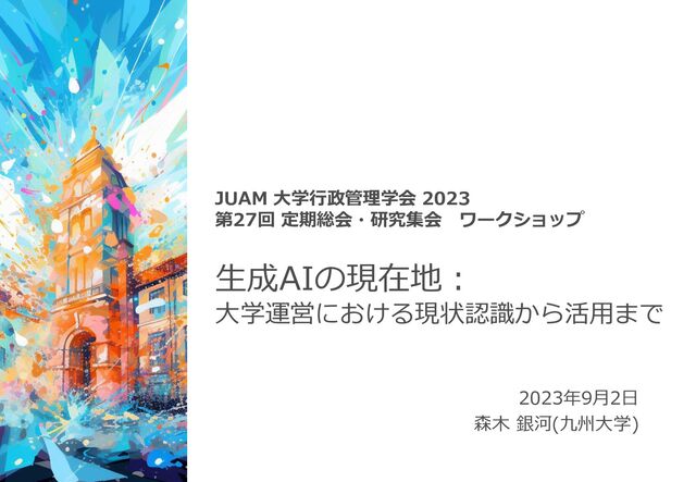 AI”における定義 生成AI(Generative AI)とは、一般的に、写真、テキスト、コンピュータコード…など、ユー ザーからの指示に基づいてオリジナルのコンテンツを生成できる人工知能(AI)の一種である。 https://aismiley.co.jp/ai_news/what-is-generative-ai/ “The Promise and Potential Risks of Generative AI”、 https://core.verisk.com/Insights/EmergingIssues/Articles/2023/January-2023/Week-4/Generative-AI