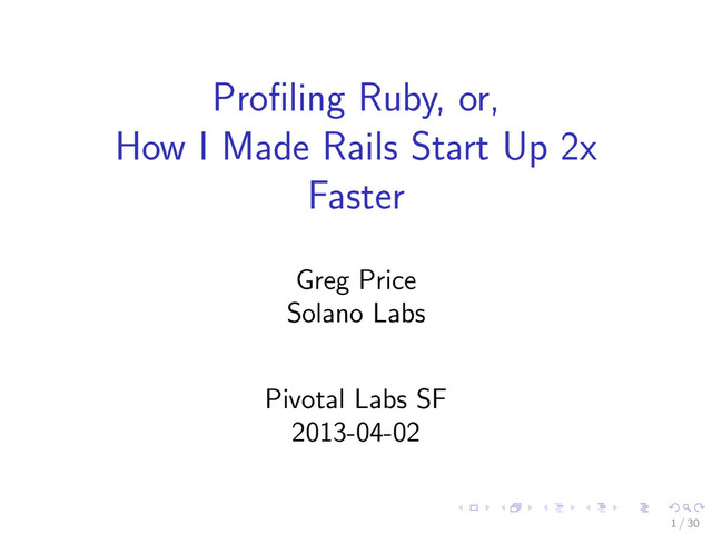 Ruby 2.0 starts applications in less than half the time taken by 1.9.3. We'll see the techniques I used to diagnose (and fix) the problem, which can be used for any performance problem in MRI or a C extension. The same principles apply to fixing performance problems in Ruby code.