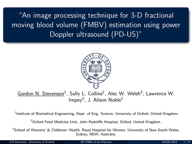 (FMBV) estimation using power Doppler ultrasound (PD-US)” Gordon N. Stevenson1, Sally L. Collins2, Alec W. Welsh3, Lawrence W. Impey2, J. Alison Noble1 1Institute of Biomedical Engineering, Dept. of Eng. Science, University of Oxford, United Kingdom. 2Oxford Fetal Medicine Unit, John Radcliffe Hospital, Oxford, United Kingdom. 3School of Womens’ & Childrens’ Health, Royal Hospital for Women, University of New South Wales, Sydney, NSW, Australia. G.N Stevenson (University of Oxford) 3D FMBV of the Placenta ISUOG 2012 1 / 9
