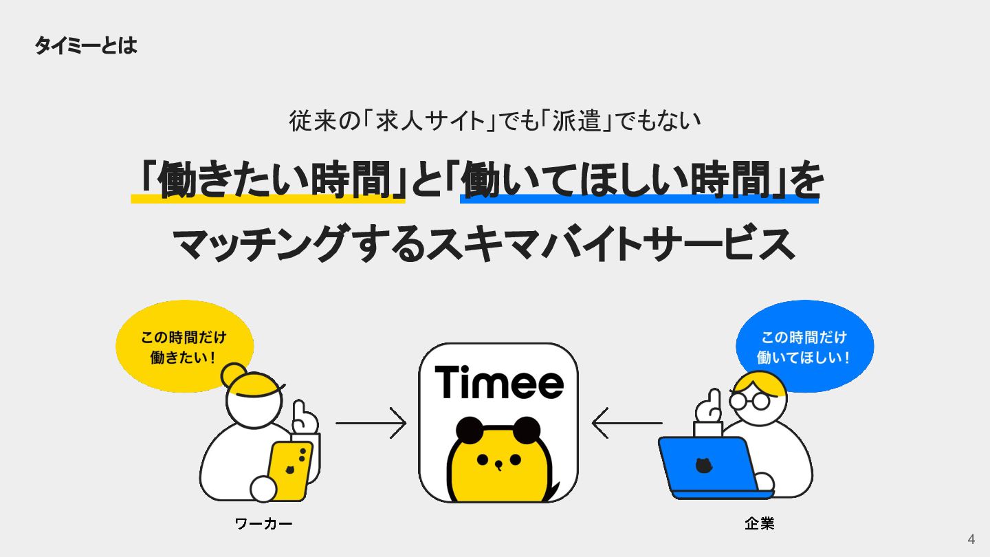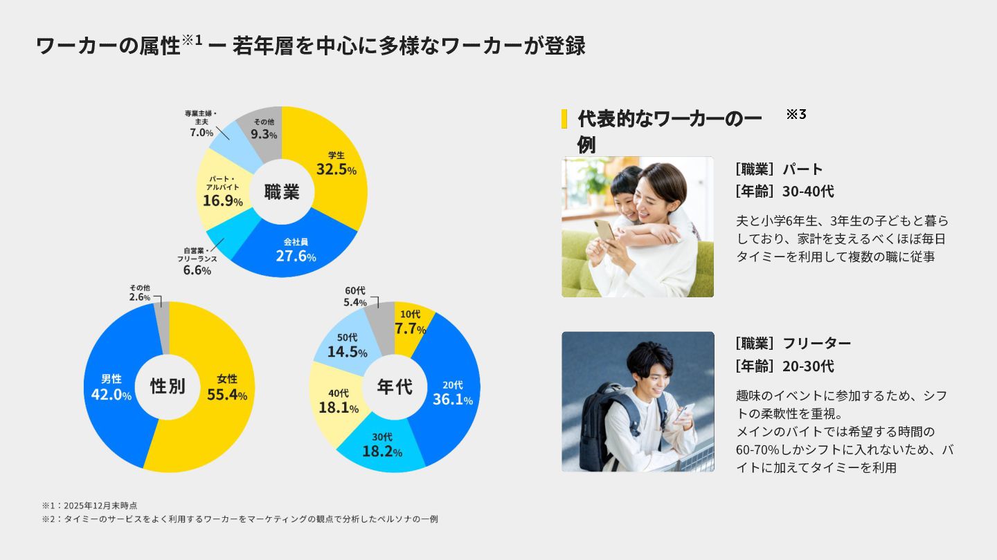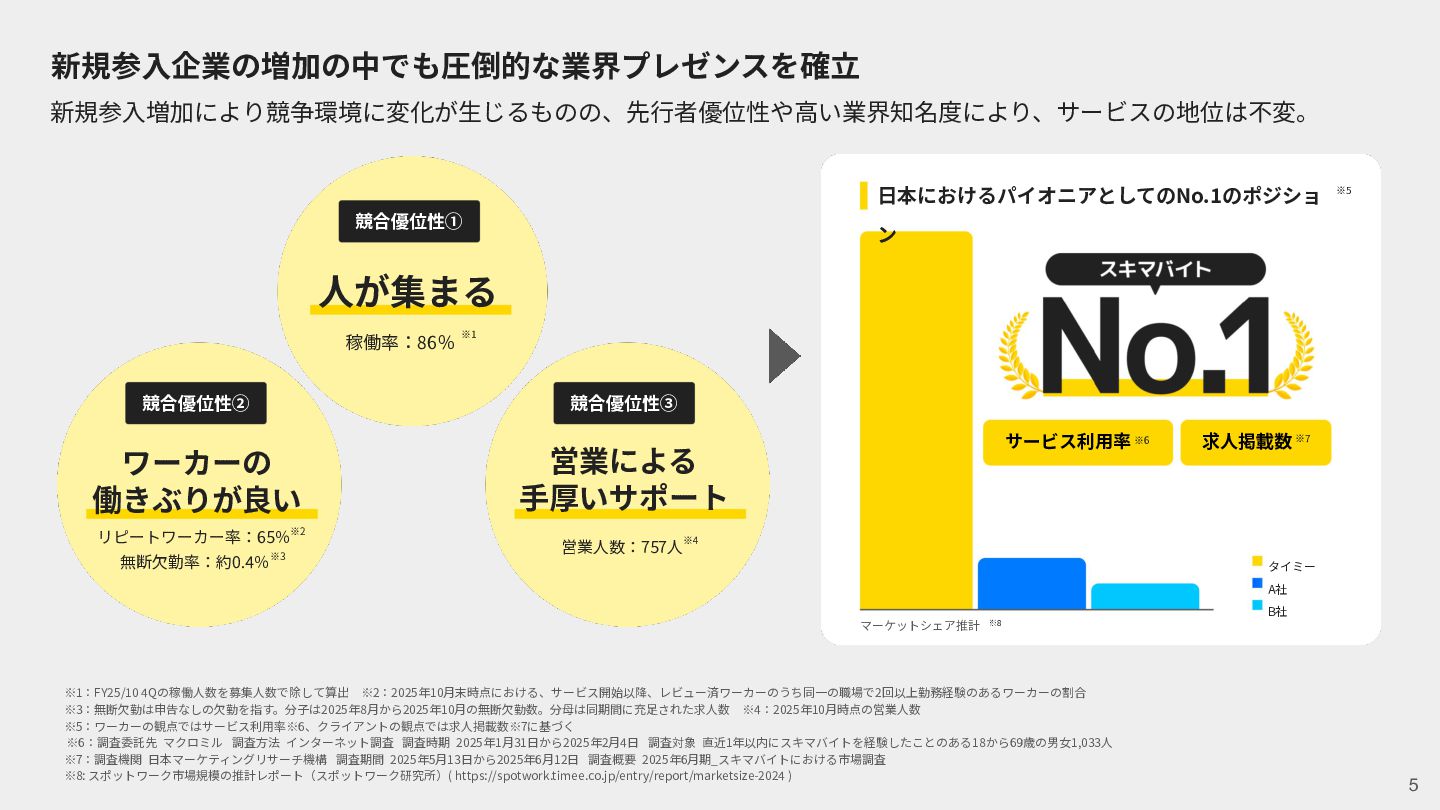 営業による 営業⼈数:757⼈※4 競合優位性③ ※7 求⼈掲載数 ※6 サービス利⽤率 タイミー A社 B社 ※8 マーケットシェア推計 ⽇本におけるパイオニアとしてのNo.1のポジショ ン ※5 新規参⼊企業の増加の中でも圧倒的な業界プレゼンスを確⽴ 新規参⼊増加により競争環境に変化が⽣じるものの、先⾏者優位性や⾼い業界知名度により、サービスの地位は不変。 ※1:FY25/10 4Qの稼働⼈数を募集⼈数で除して算出 ※2:2025年10⽉末時点における、サービス開始以降、レビュー済ワーカーのうち同⼀の職場で2回以上勤務経験のあるワーカーの割合 ※3:無断⽋勤は申告なしの⽋勤を指す。分⼦は2025年8⽉から2025年10⽉の無断⽋勤数。分⺟は同期間に充⾜された求⼈数 ※4:2025年10⽉時点の営業⼈数 ※5:ワーカーの観点ではサービス利⽤率※6、クライアントの観点では求⼈掲載数※7に基づく ※6:調査委託先 マクロミル 調査⽅法 インターネット調査 調査時期 2025年1⽉31⽇から2025年2⽉4⽇ 調査対象 直近1年以内にスキマバイトを経験したことのある18から69歳の男⼥1,033⼈ ※7:調査機関 ⽇本マーケティングリサーチ機構 調査期間 2025年5⽉13⽇から2025年6⽉12⽇ 調査概要 2025年6⽉期_スキマバイトにおける市場調査 ※8: スポットワーク市場規模の推計レポート(スポットワーク研究所)( https://spotwork.timee.co.jp/entry/report/marketsize-2024 ) 5