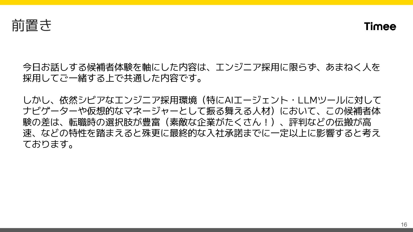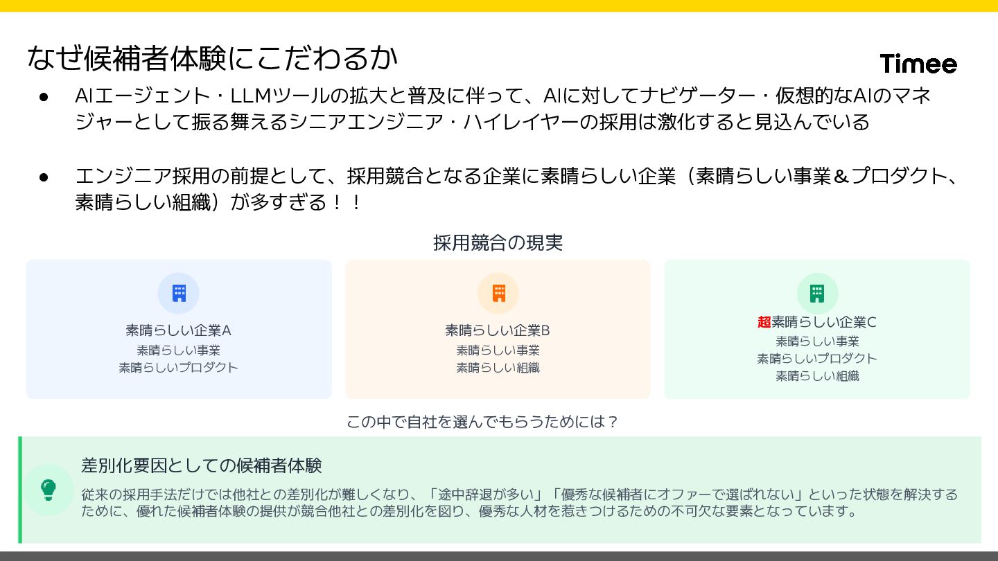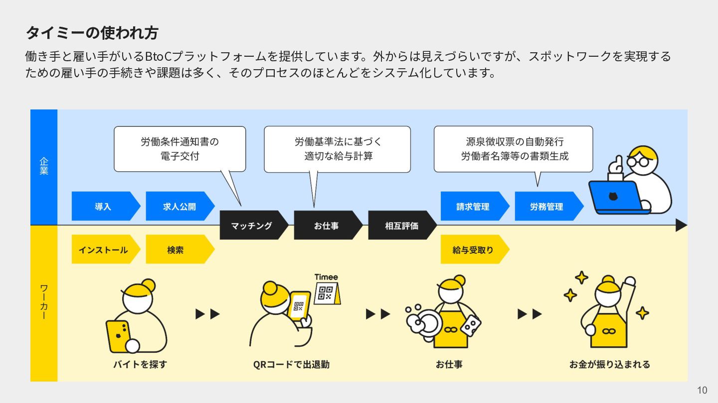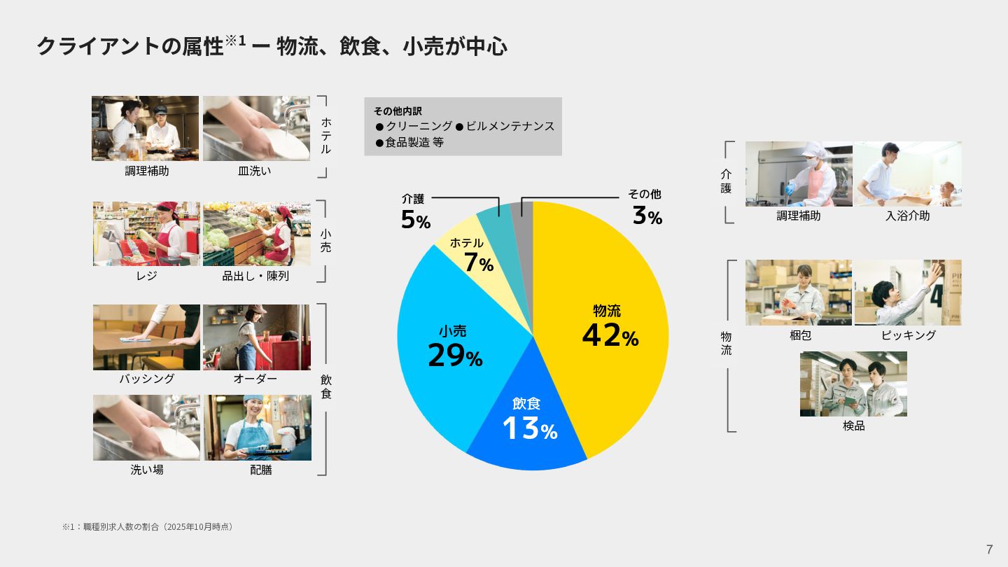 営業による 営業⼈数:757⼈※4 競合優位性③ ※7 求⼈掲載数 ※6 サービス利⽤率 タイミー A社 B社 ※8 マーケットシェア推計 ⽇本におけるパイオニアとしてのNo.1のポジショ ン ※5 新規参⼊企業の増加の中でも圧倒的な業界プレゼンスを確⽴ 新規参⼊増加により競争環境に変化が⽣じるものの、先⾏者優位性や⾼い業界知名度により、サービスの地位は不変。 ※1:FY25/10 4Qの稼働⼈数を募集⼈数で除して算出 ※2:2025年10⽉末時点における、サービス開始以降、レビュー済ワーカーのうち同⼀の職場で2回以上勤務経験のあるワーカーの割合 ※3:無断⽋勤は申告なしの⽋勤を指す。分⼦は2025年8⽉から2025年10⽉の無断⽋勤数。分⺟は同期間に充⾜された求⼈数 ※4:2025年10⽉時点の営業⼈数 ※5:ワーカーの観点ではサービス利⽤率※6、クライアントの観点では求⼈掲載数※7に基づく ※6:調査委託先 マクロミル 調査⽅法 インターネット調査 調査時期 2025年1⽉31⽇から2025年2⽉4⽇ 調査対象 直近1年以内にスキマバイトを経験したことのある18から69歳の男⼥1,033⼈ ※7:調査機関 ⽇本マーケティングリサーチ機構 調査期間 2025年5⽉13⽇から2025年6⽉12⽇ 調査概要 2025年6⽉期_スキマバイトにおける市場調査 ※8: スポットワーク市場規模の推計レポート(スポットワーク研究所)( https://spotwork.timee.co.jp/entry/report/marketsize-2024 ) 5