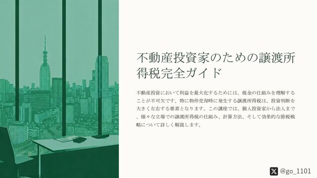 不動産投資において利益を最大化するためには、税金の仕組みを理解することが不可欠です。特に物件売却時に発生する譲渡所得税は、投資判断を大きく左右する要素となります。この講座では、個人投資家から法人まで、様々な立場での譲渡所得税の仕組み、計算方法、そして効果的な節税戦略について詳しく解説します。