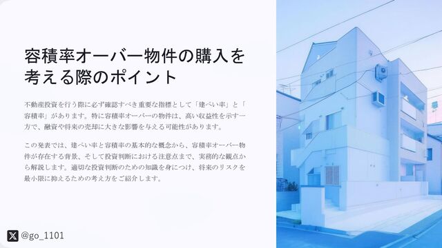 不動産投資を行う際に必ず確認すべき重要な指標として「建ぺい率」と「容積率」があります。特に容積率オーバーの物件は、高い収益性を示す一方で、融資や将来の売却に大きな影響を与える可能性があります。 この発表では、建ぺい率と容積率の基本的な概念から、容積率オーバー物件が存在する背景、そして投資判断における注意点まで、実務的な観点から解説します。適切な投資判断のための知識を身につけ、将来のリスクを最小限に抑えるための考え方をご紹介します。