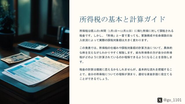 所得税は個人の1年間(1月1日~12月31日)に得た所得に対して課税される税金です。しかし、「所得」と一言で言っても、家族構成や生命保険の加入状況によって実際の課税対象額は大きく変わります。この発表では、所得税の仕組みや課税対象額の計算方法について、具体的な例を交えながらわかりやすく解説します。給与所得者の方が自分の所得税がどのように計算されているのか理解できるようになることを目指します。