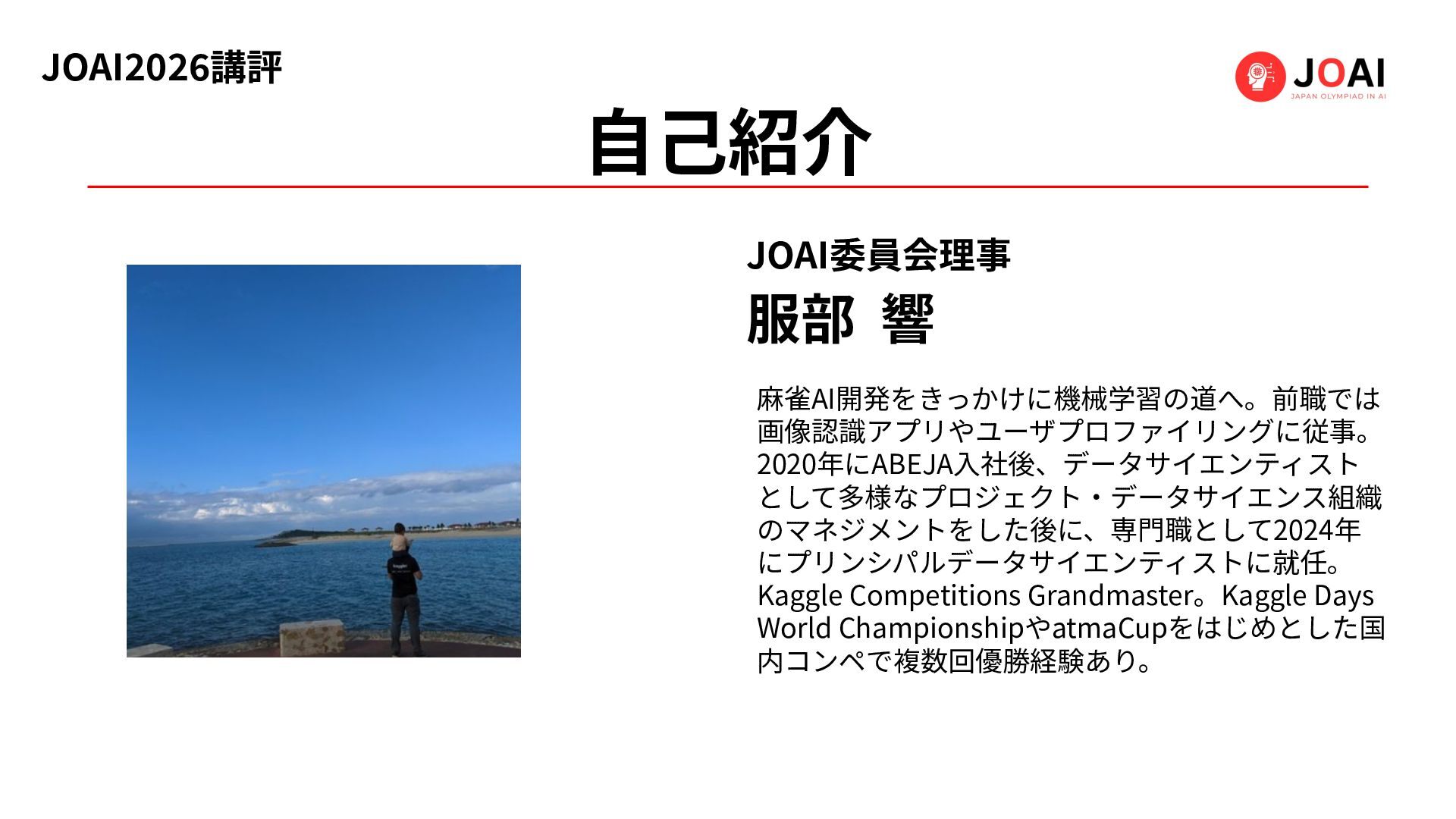 JOAI2026講評 ⿇雀AI開発をきっかけに機械学習の道へ。前職では 画像認識アプリやユーザプロファイリングに従事。 2020年にABEJA⼊社後、データサイエンティスト として多様なプロジェクト‧データサイエンス組織 のマネジメントをした後に、専⾨職として2024年 にプリンシパルデータサイエンティストに就任。 Kaggle Competitions Grandmaster。Kaggle