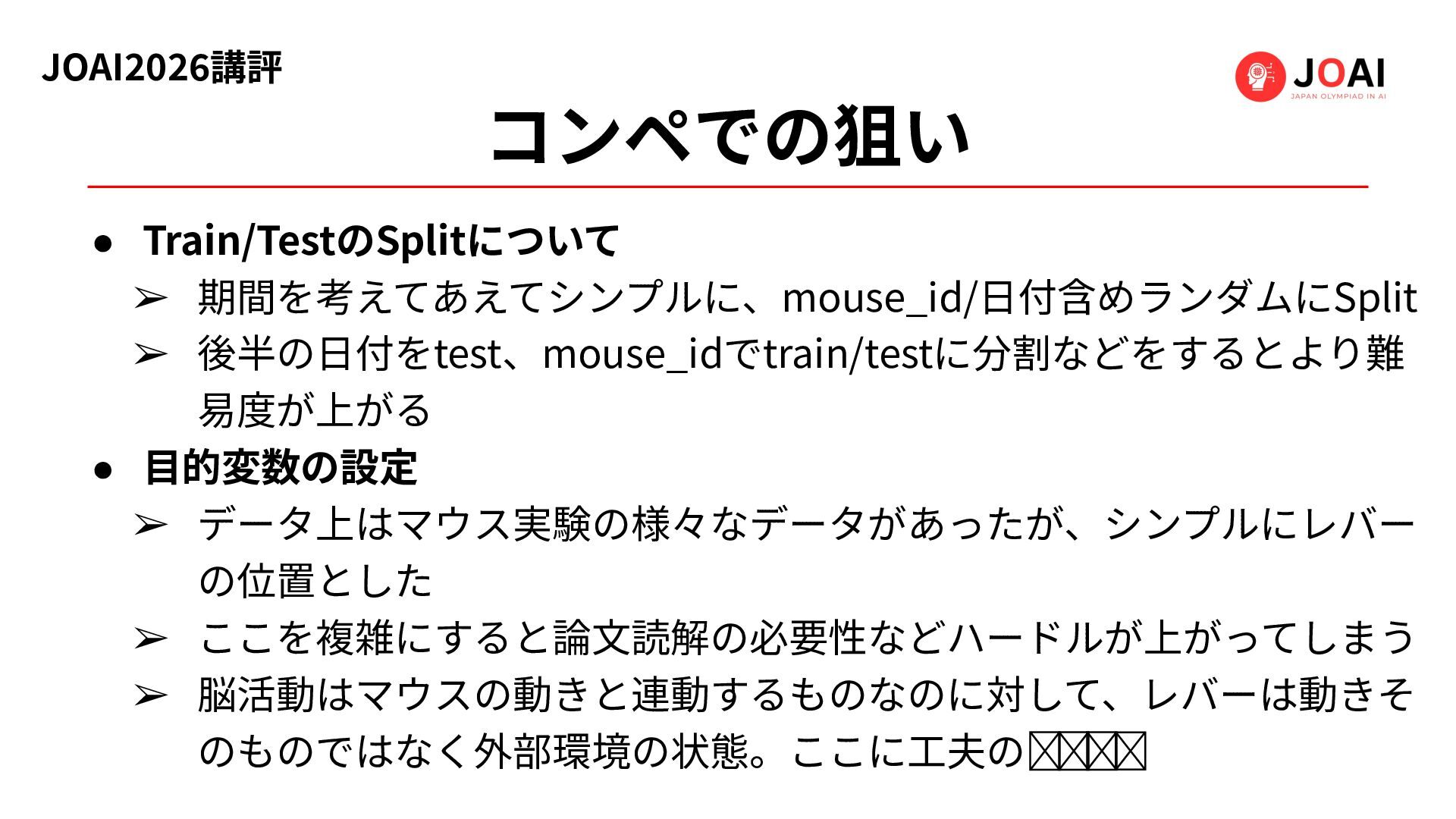 ➢ データ上はマウス実験の様々なデータがあったが、シンプルにレバー の位置とした ➢ ここを複雑にすると論⽂読解の必要性などハードルが上がってしまう ➢ 脳活動はマウスの動きと連動するものなのに対して、レバーは動きそ のものではなく外部環境の状態。ここに⼯夫の余地を残した JOAI2026講評