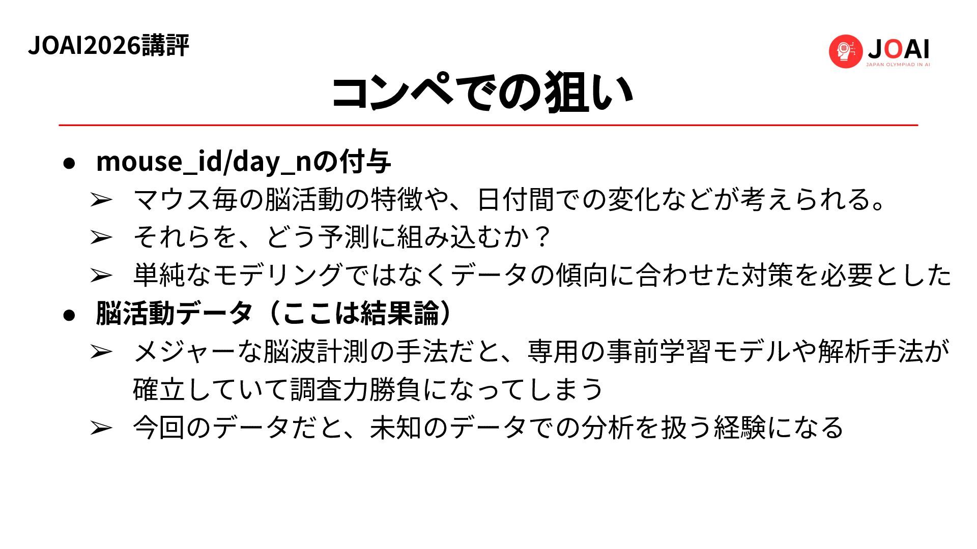 脳活動データ(ここは結果論) ➢ メジャーな脳波計測の⼿法だと、専⽤の事前学習モデルや解析⼿法が 確⽴していて調査⼒勝負になってしまう ➢ 今回のデータだと、未知のデータでの分析を扱う経験になる JOAI2026講評