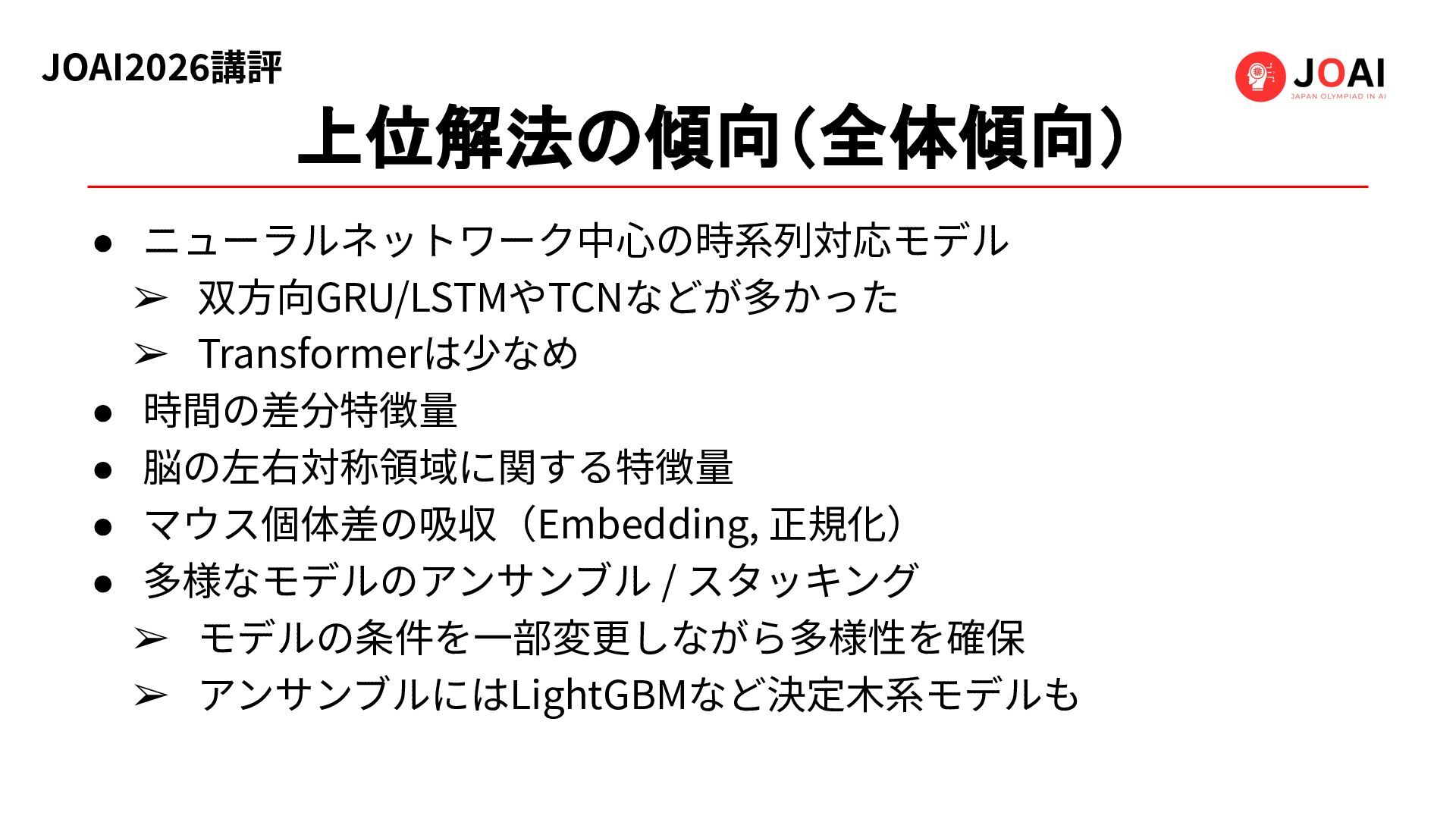 脳の左右対称領域に関する特徴量 • マウス個体差の吸収(Embedding, 正規化) • 多様なモデルのアンサンブル / スタッキング ➢ モデルの条件を⼀部変更しながら多様性を確保 ➢ アンサンブルにはLightGBMなど決定⽊系モデルも JOAI2026講評