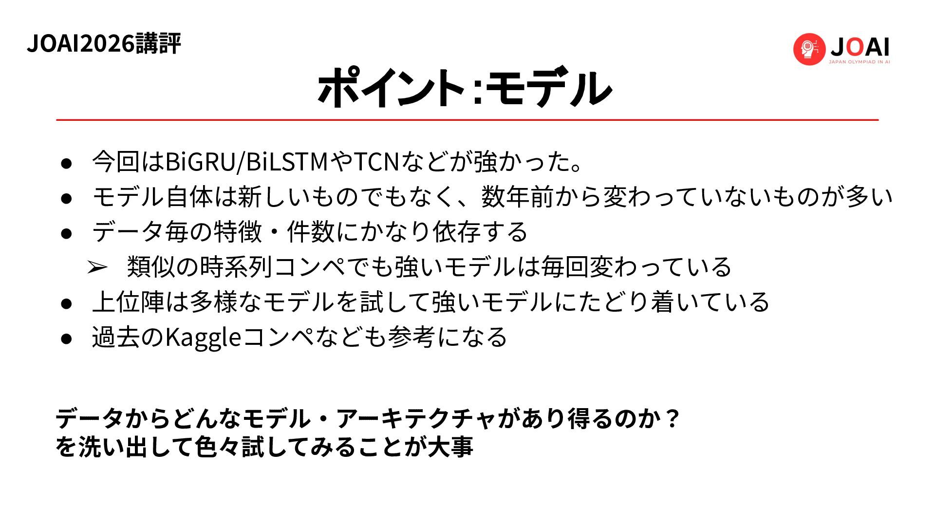 上位陣は多様なモデルを試して強いモデルにたどり着いている • 過去のKaggleコンペなども参考になる データからどんなモデル‧アーキテクチャがあり得るのか? を洗い出して⾊々試してみることが⼤事 JOAI2026講評