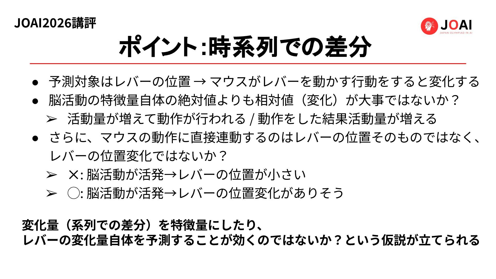 動作をした結果活動量が増える • さらに、マウスの動作に直接連動するのはレバーの位置そのものではなく、 レバーの位置変化ではないか? ➢ ✕: 脳活動が活発→レバーの位置が⼩さい ➢ ◯: 脳活動が活発→レバーの位置変化がありそう 変化量(系列での差分)を特徴量にしたり、 レバーの変化量⾃体を予測することが効くのではないか?という仮説が⽴てられる JOAI2026講評