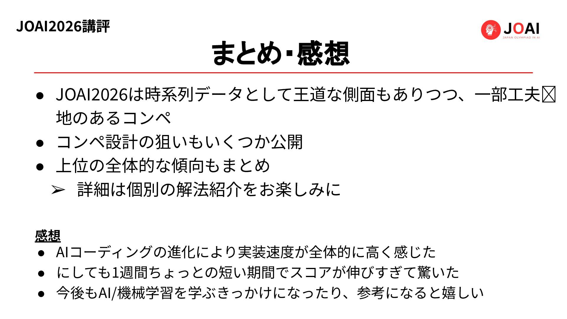まとめ・感想 • JOAI2026は時系列データとして王道な側⾯もありつつ、⼀部⼯夫余 地のあるコンペ • コンペ設計の狙いもいくつか公開 • 上位の全体的な傾向もまとめ ➢ 詳細は個別の解法紹介をお楽しみに