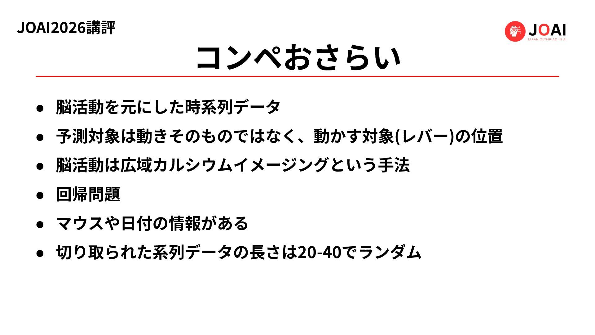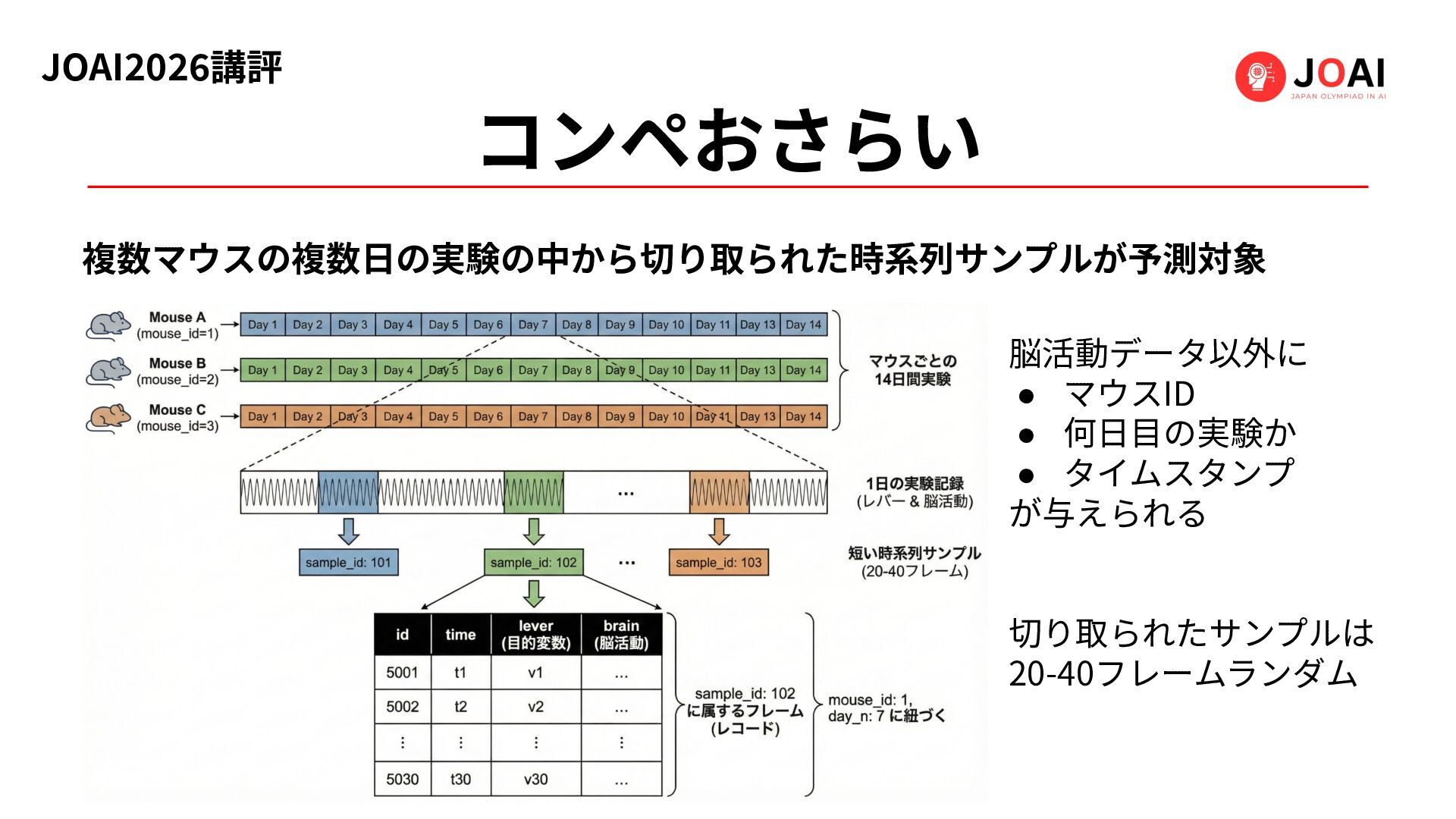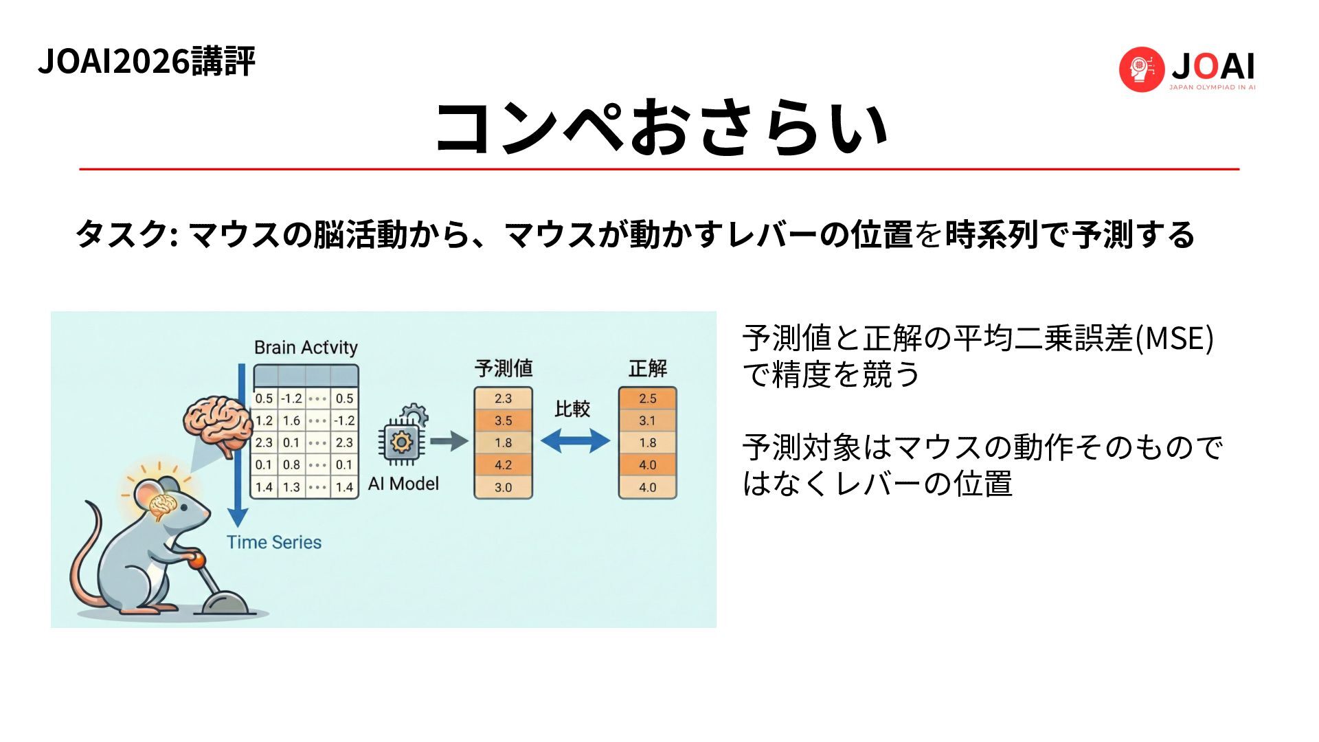 JOAI2026講評 コンペおさらい タスク: マウスの脳活動から、マウスが動かすレバーの位置を時系列で予測する 予測値と正解の平均⼆乗誤差(MSE) で精度を競う 予測対象はマウスの動作そのもので はなくレバーの位置