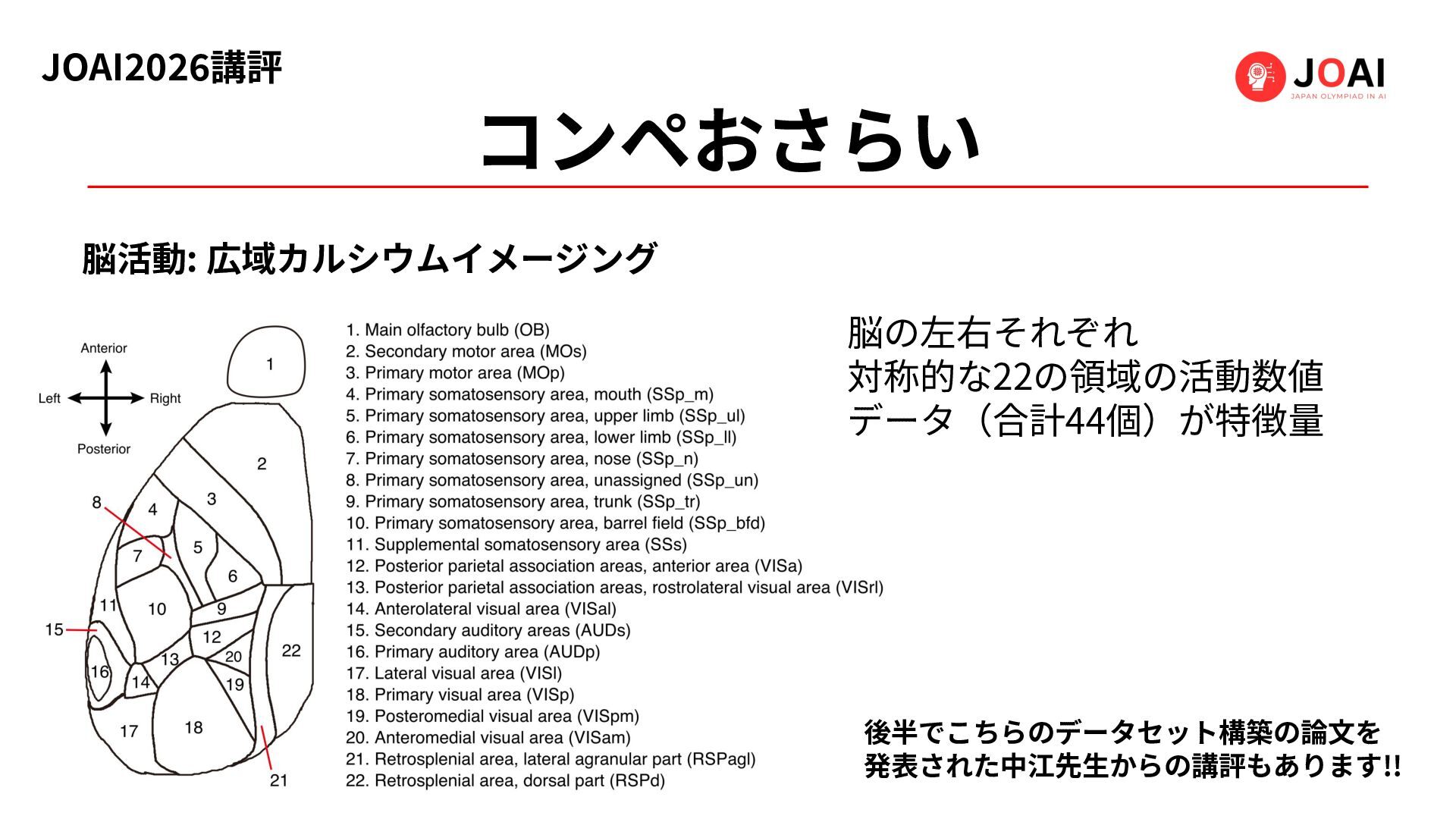 コンペおさらい 脳活動: 広域カルシウムイメージング 脳の左右それぞれ 対称的な22の領域の活動数値 データ(合計44個)が特徴量 後半でこちらのデータセット構築の論⽂を 発表された中江先⽣からの講評もあります!! JOAI2026講評