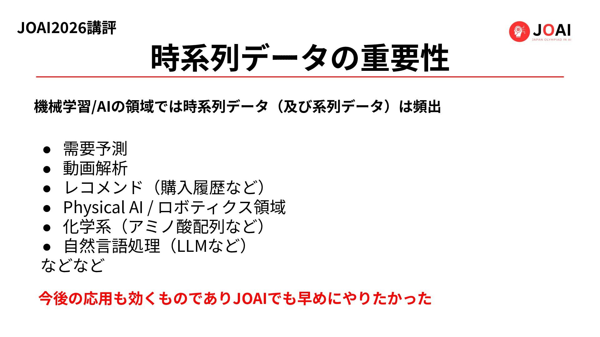 AI / ロボティクス領域 • 化学系(アミノ酸配列など) • ⾃然⾔語処理(LLMなど) などなど 今後の応⽤も効くものでありJOAIでも早めにやりたかった JOAI2026講評