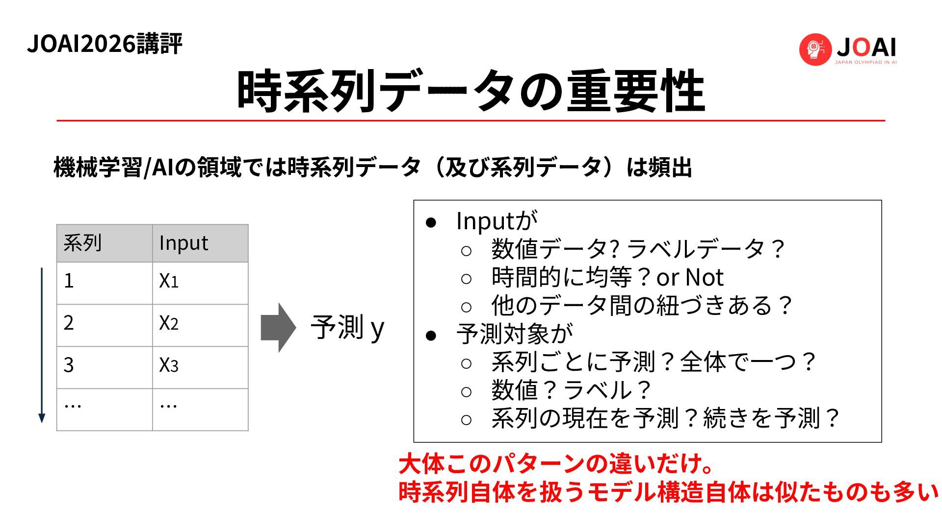 … … 予測 y • Inputが ◦ 数値データ? ラベルデータ? ◦ 時間的に均等?or Not ◦ 他のデータ間の紐づきある? • 予測対象が ◦ 系列ごとに予測?全体で⼀つ? ◦ 数値?ラベル? ◦ 系列の現在を予測?続きを予測? ⼤体このパターンの違いだけ。 時系列⾃体を扱うモデル構造⾃体は似たものも多い JOAI2026講評