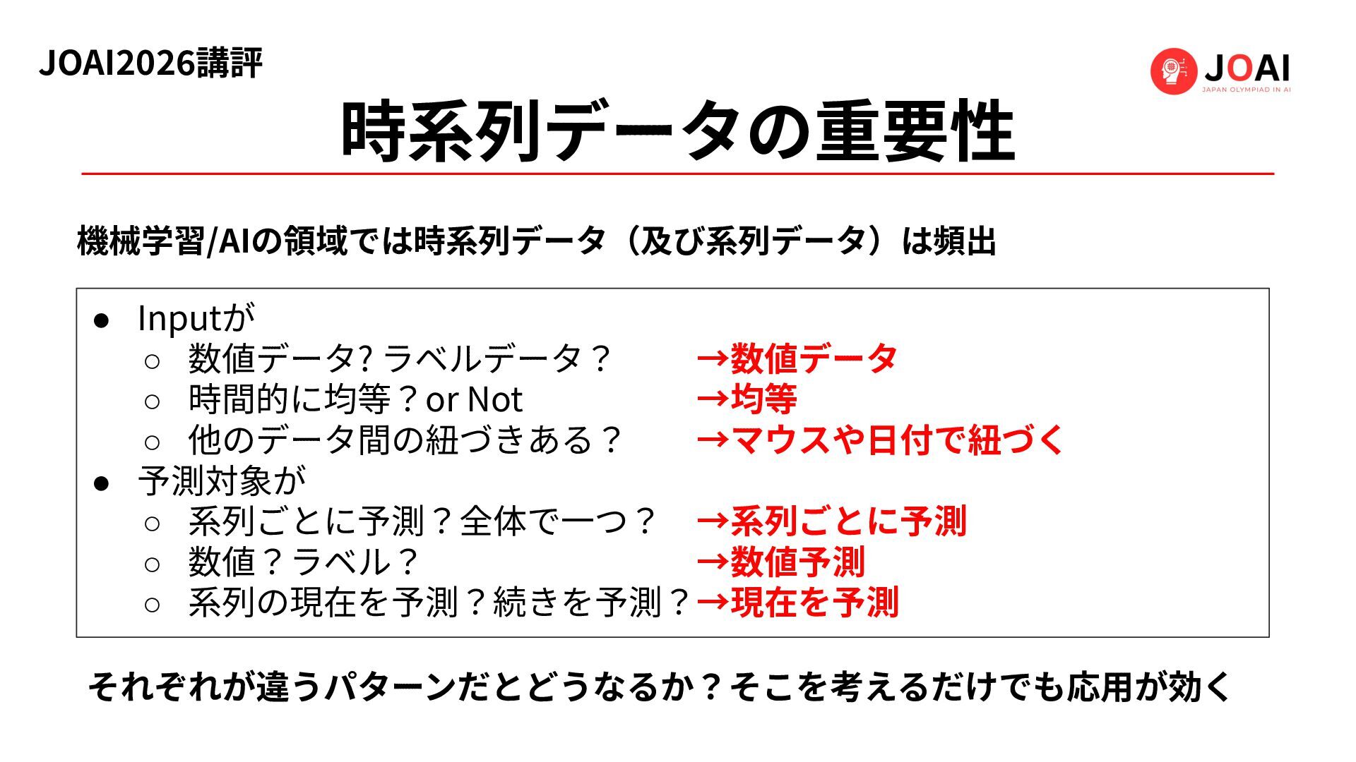 Not →均等 ◦ 他のデータ間の紐づきある? →マウスや⽇付で紐づく • 予測対象が ◦ 系列ごとに予測?全体で⼀つ? →系列ごとに予測 ◦ 数値?ラベル? →数値予測 ◦ 系列の現在を予測?続きを予測?→現在を予測 それぞれが違うパターンだとどうなるか?そこを考えるだけでも応⽤が効く JOAI2026講評
