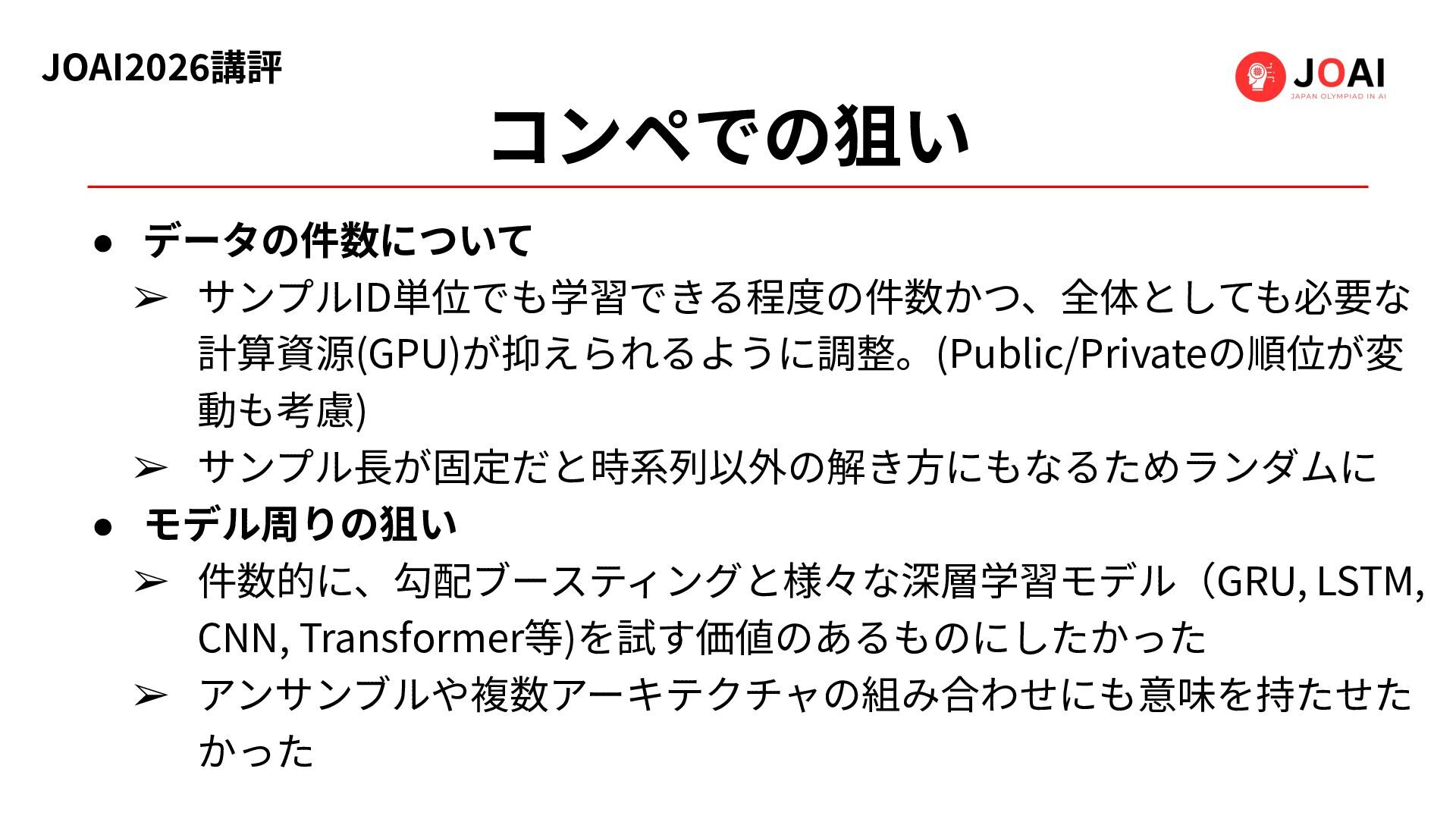 モデル周りの狙い ➢ 件数的に、勾配ブースティングと様々な深層学習モデル(GRU, LSTM, CNN, Transformer等)を試す価値のあるものにしたかった ➢ アンサンブルや複数アーキテクチャの組み合わせにも意味を持たせた かった JOAI2026講評