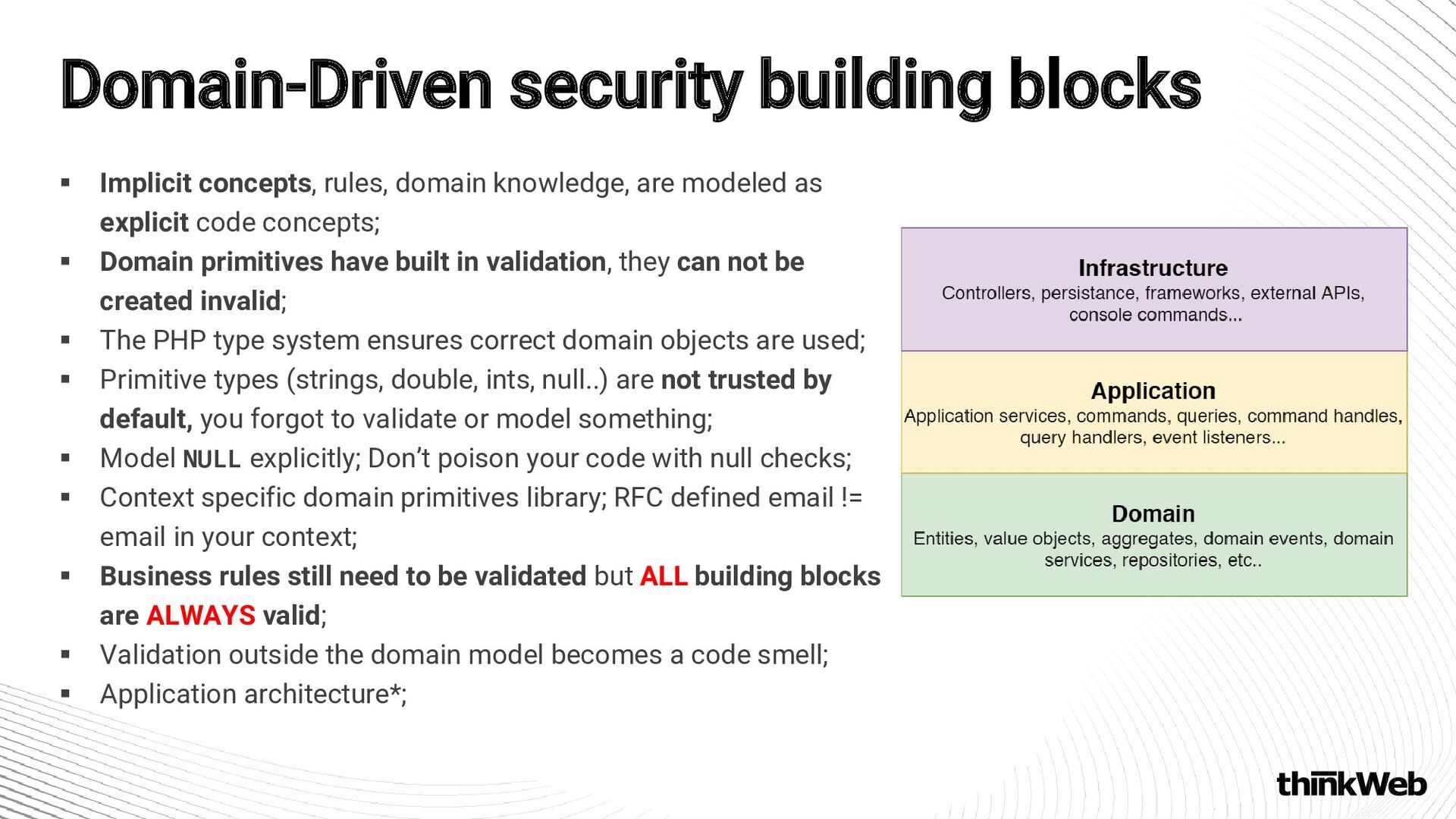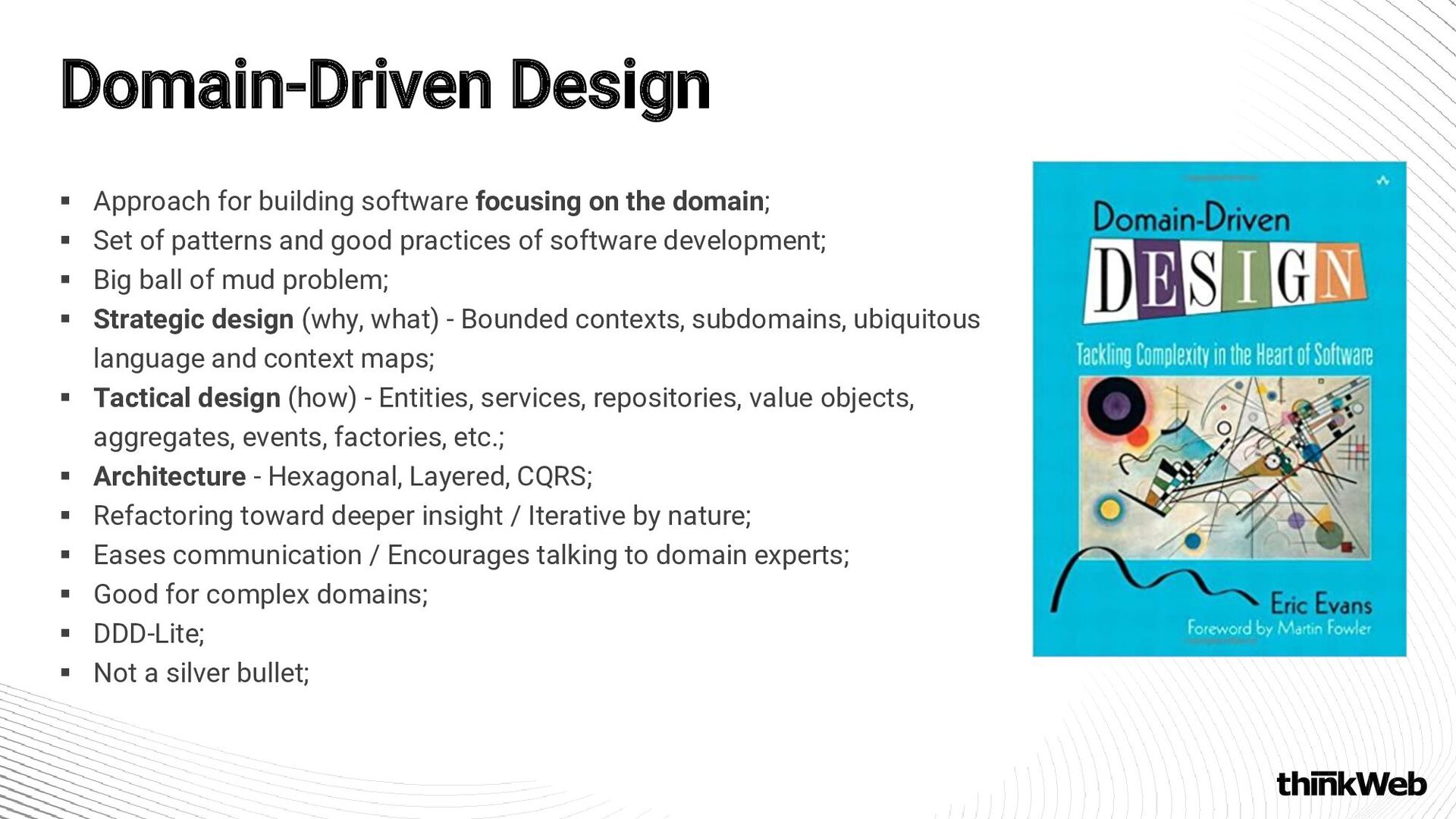 Set of patterns and good practices of software development; ▪ Big ball of mud problem; ▪ Strategic design (why, what) - Bounded contexts, subdomains, ubiquitous language and context maps; ▪ Tactical design (how) - Entities, services, repositories, value objects, aggregates, events, factories, etc.; ▪ Architecture - Hexagonal, Layered, CQRS; ▪ Refactoring toward deeper insight / Iterative by nature; ▪ Eases communication / Encourages talking to domain experts; ▪ Good for complex domains; ▪ DDD-Lite; ▪ Not a silver bullet; Domain-Driven Design