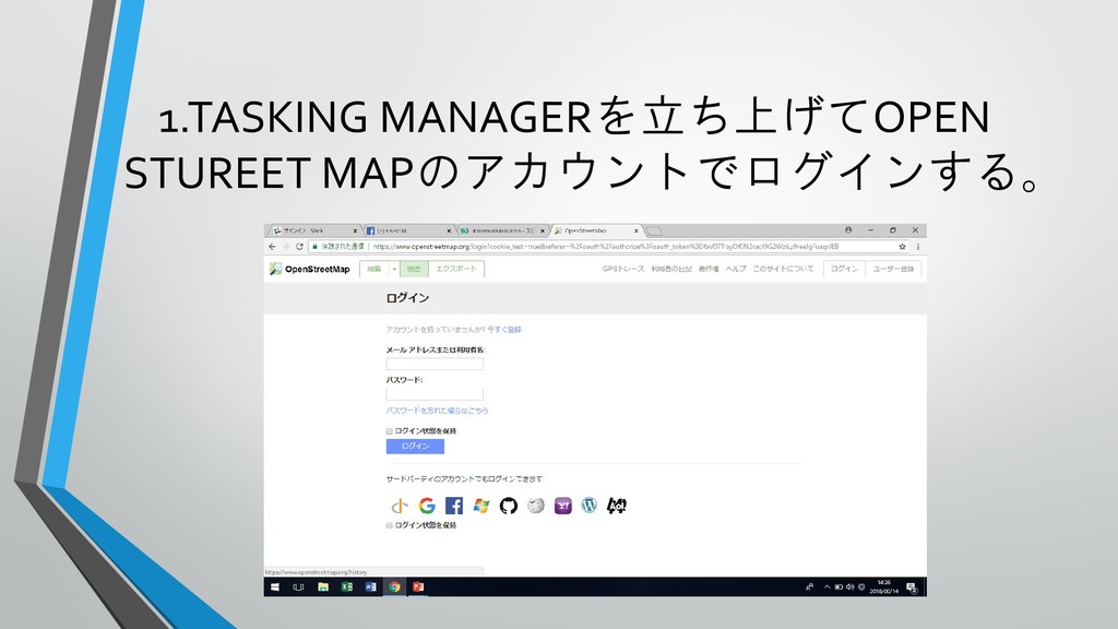 1.TASKING MANAGERを立ち上げてOPEN STUREET MAPのアカウントでログインする。
