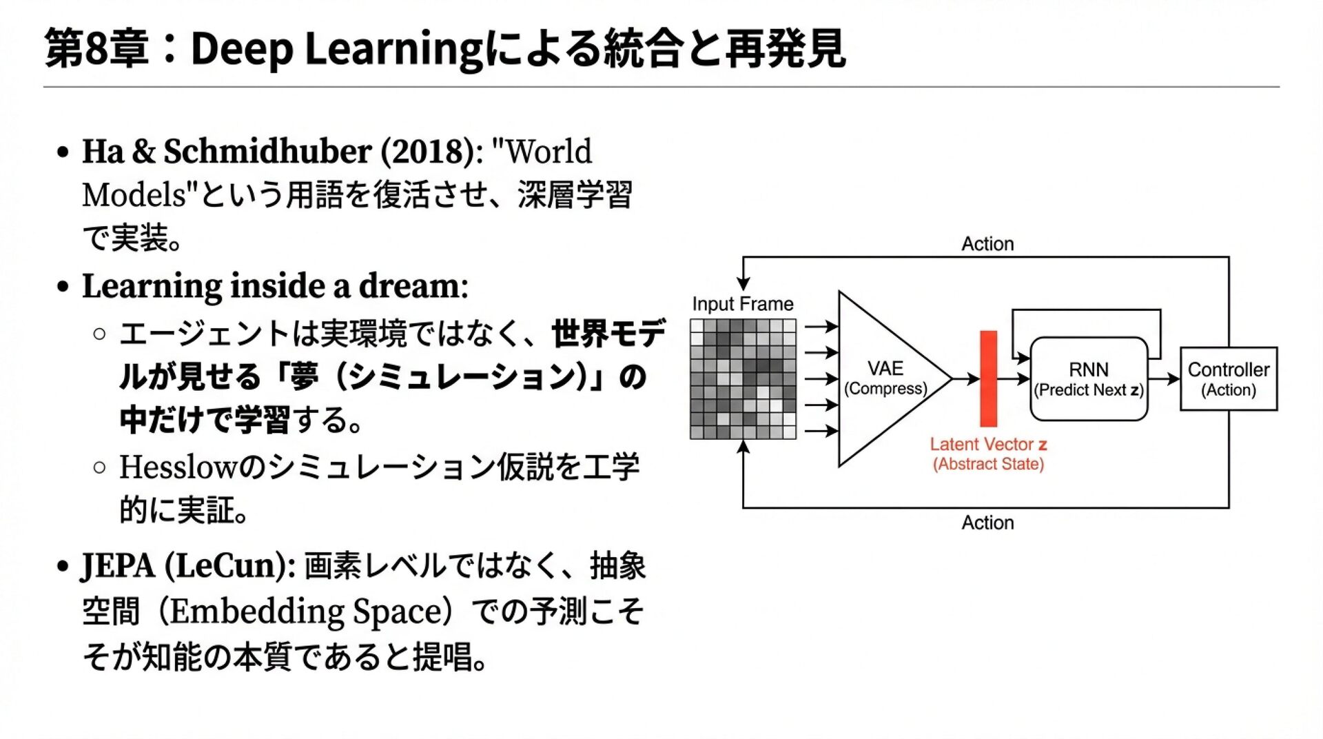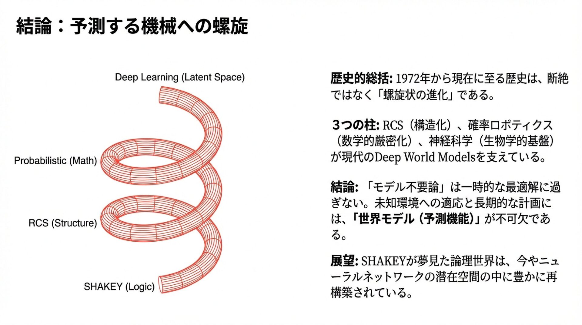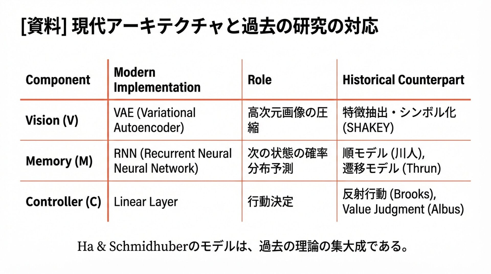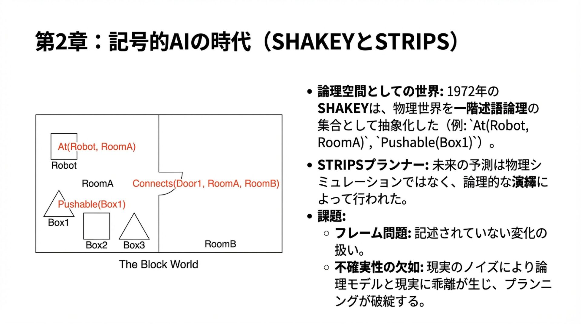このスライドは、最新の生成AIや世界モデルがロボット工学にもたらす革新的な変化について解説しています。従来のロボットは人間が詳細なルールを設計する必要がありましたが、現在は自律的な推論や予測を通じて、未知の環境や複雑な作業に適応する技術へと進化しています。具体的には、NECの能動学習を用いた効率的な動作習得や、Google・NVIDIAが追求するフィジカルAI、そして昆虫のような階層構造を持つサブサンプション・アーキテクチャなどが紹介されています。これらの技術は、ロボットが身体性を獲得し、人間と協働・共進化する社会の実現を目指しています。AIが物理的な身体を通じて実世界を理解することで、製造や物流、日常生活における自動化の可能性が大きく広がっています。