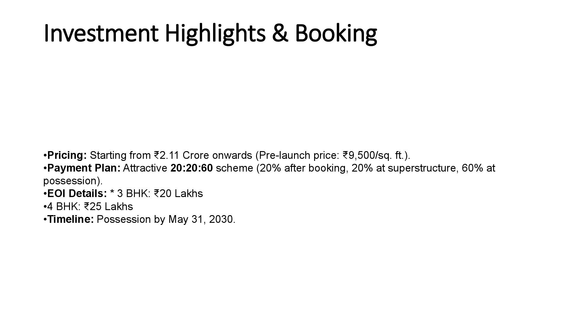 Residents can enjoy a wide range of over 60 modern lifestyle amenities, including a grand clubhouse, landscaped open spaces, fitness zones, leisure courts and family recreation areas. Designed for contemporary urban living, the community blends convenience, greenery and luxury. Prices start from ₹2.11 crore, and the project is scheduled for possession in May 2030.