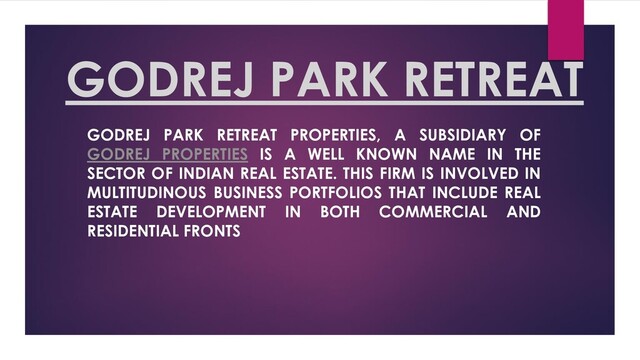 The Godrej Park Retreat Amenities and Benefits are : nearer to well-known educational institutions like Delhi Public School, Indus International School, Swiss Graduate School of Management, Bangalore Technological Institute, and the ISME-International School of Management Excellence are located in Sarjapur Road.