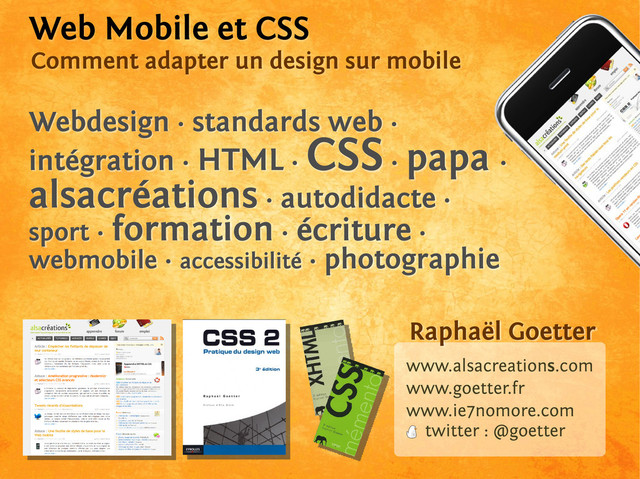 monde ? Raphaël Goetter alsacreations.com @goetter Confoo 2011 Positionnement avancé (inline-block, table-layout) CSS 2.1 avancé (:before, :after, sélecteurs, first-child) CSS 3 (border-radius, box-shadow, @font-face, flexible model, transparence, transformations, animations, media-query) HTML 5 (formulaires, géolocalisation, etc.)