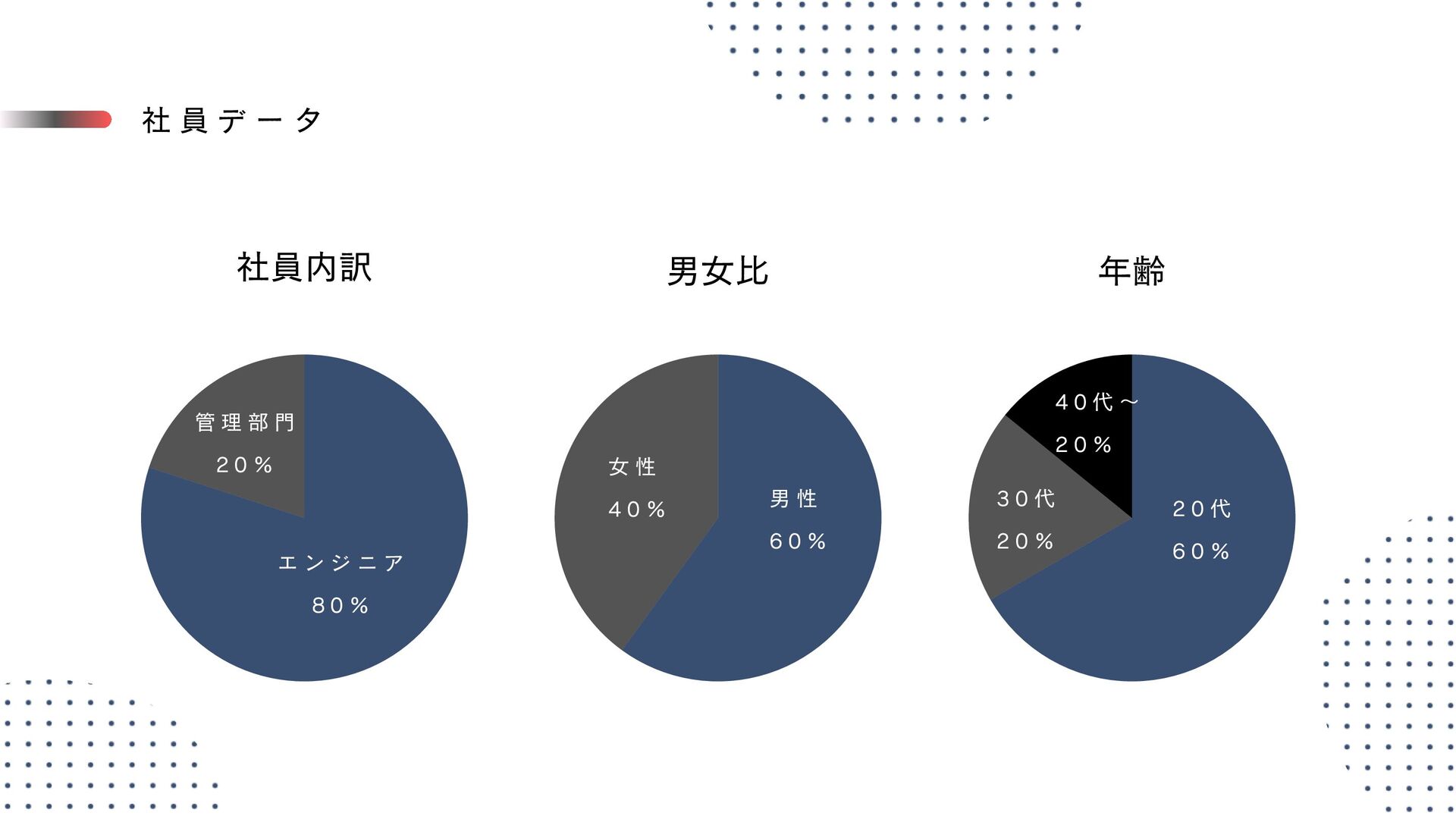 % 4 0 代 ~ 2 0 % 3 0 代 2 0 % 年齢 社員内訳 男女比 女 性 4 0 % 男 性 6 0 % エ ン ジ ニ ア 8 0 % 管 理 部 門 2 0 %