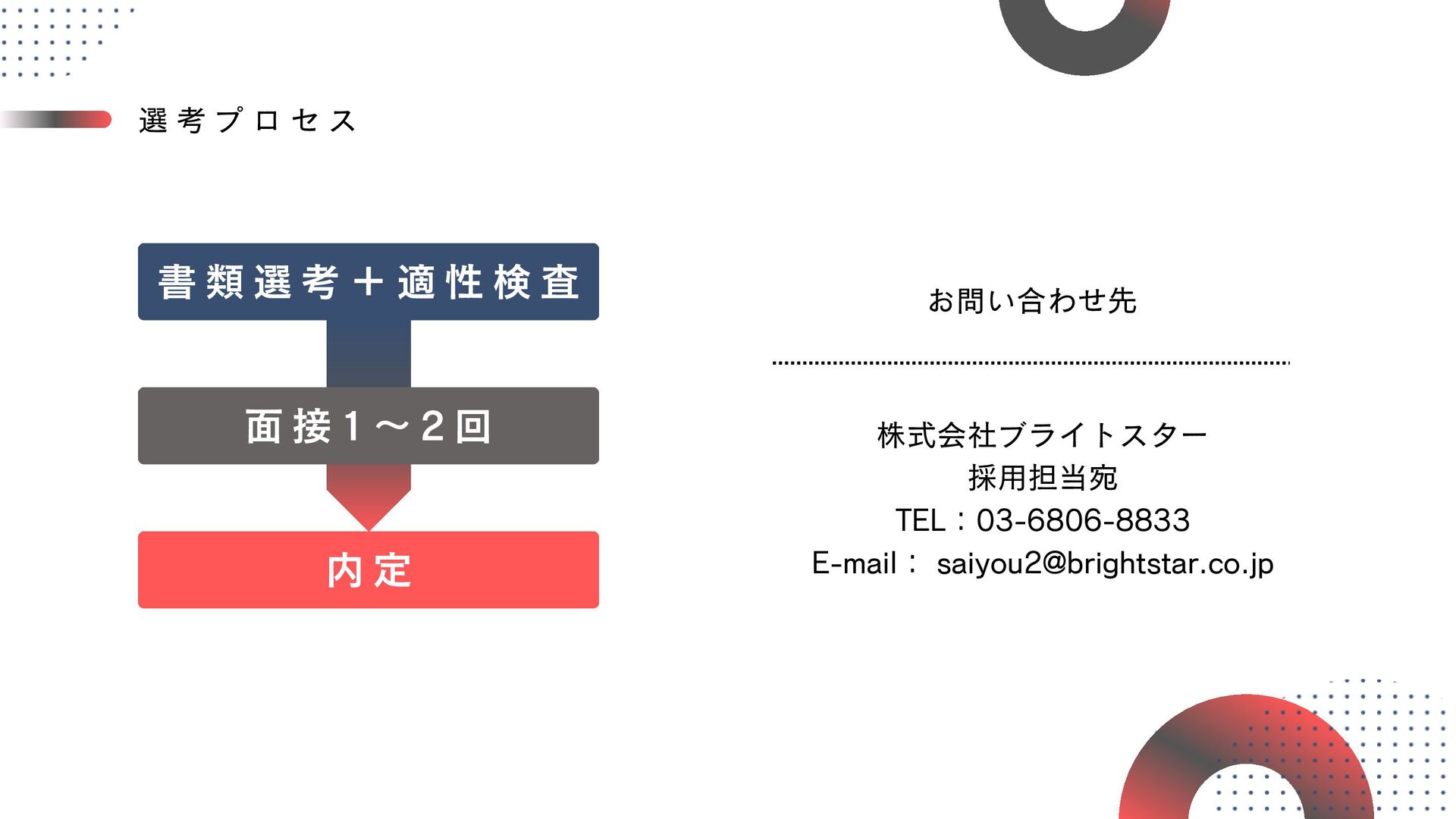 接 1 ~ 2 回 内 定 株式会社ブライトスター 採用担当宛 TEL:03-6806-8833 E-mail: