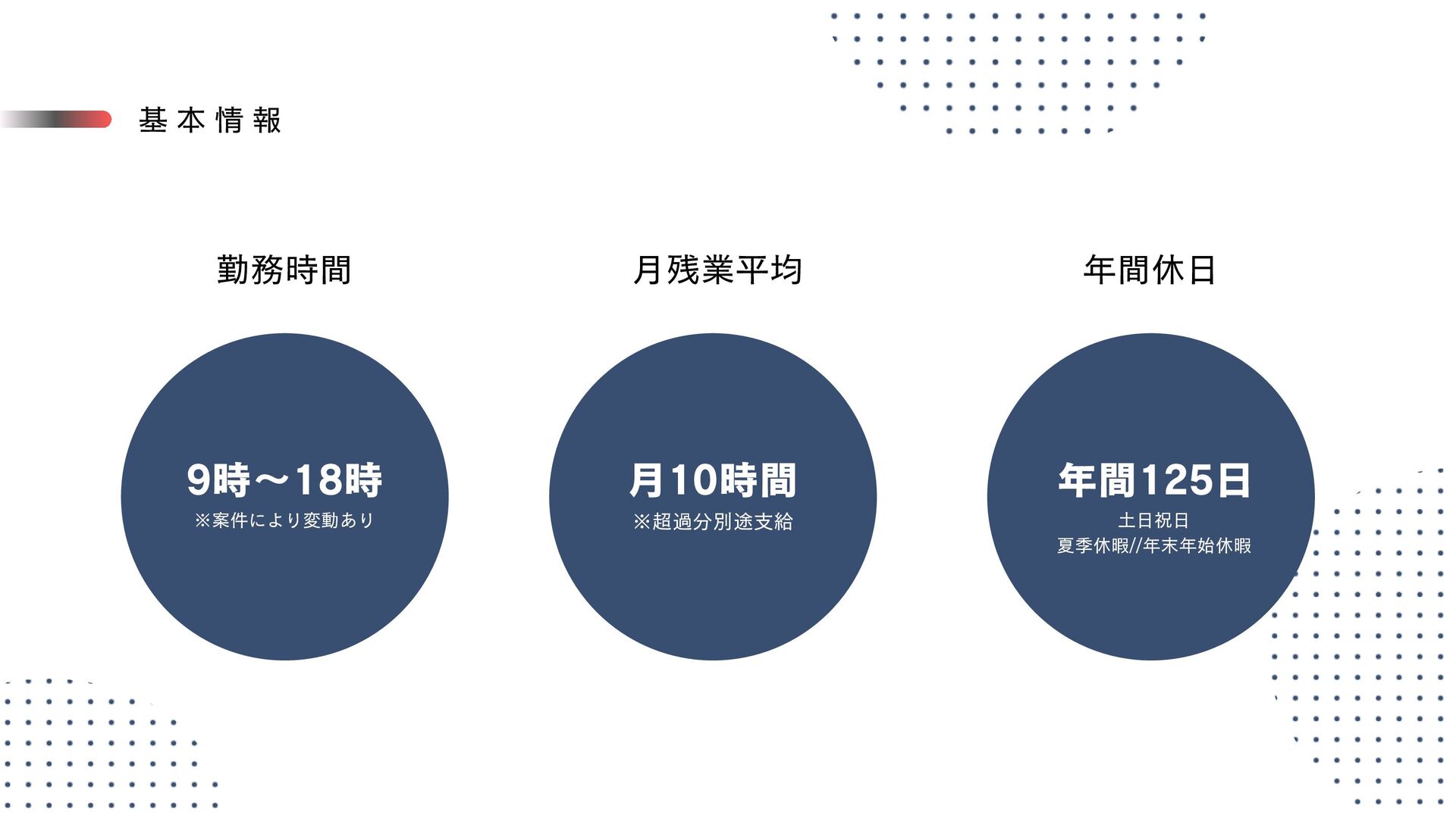 基 本 情 報 勤務時間 月残業平均 年間休日 9時~18時 月10時間 年間125日