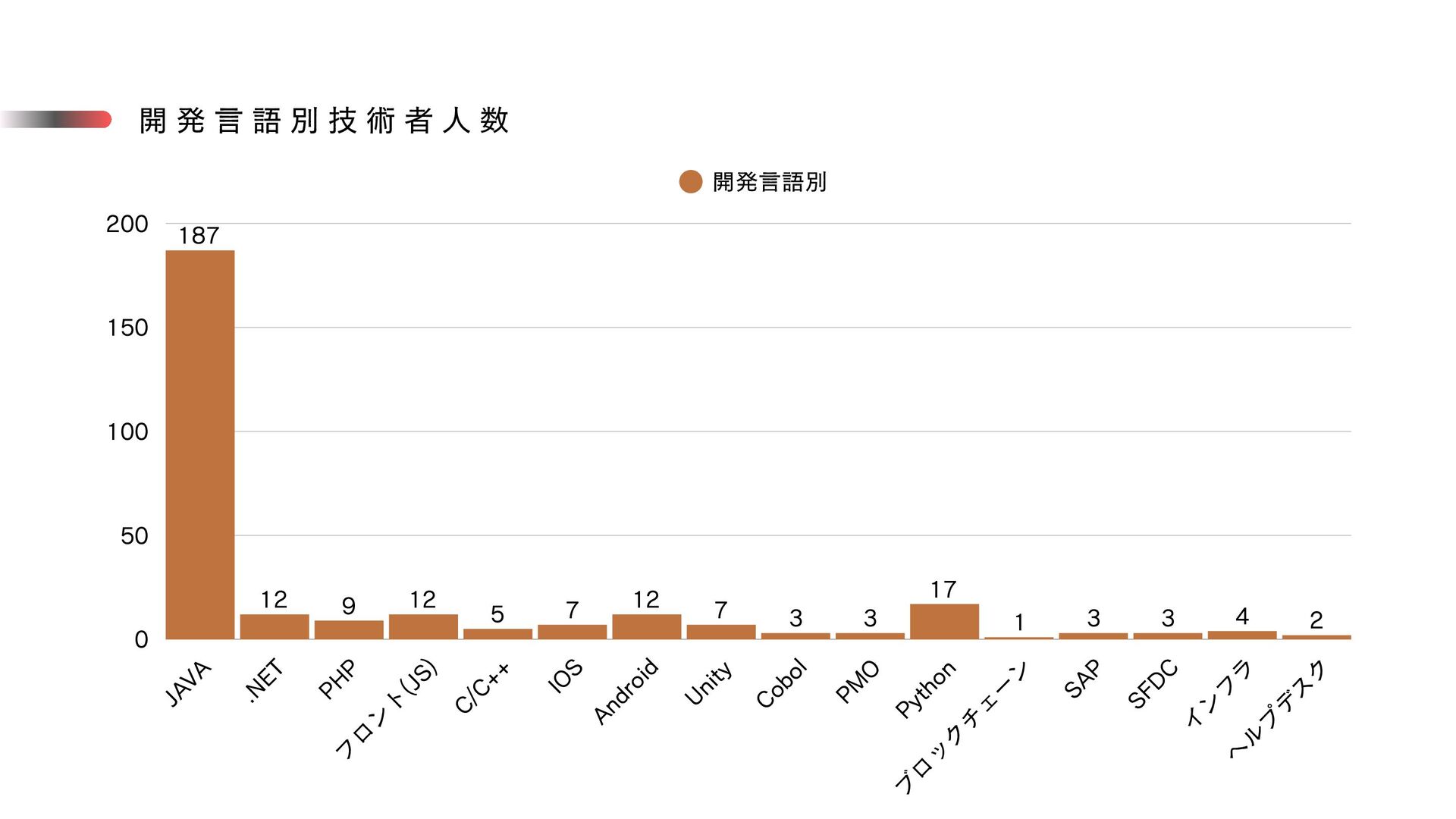 IO S Android Unity Cobol PM O Python ブ ロ ッ ク チ ェ ー ン SAP SFD C イ ン フ ラ へ ル プ デ ス ク 0 50 100 150 200 187 12 9 12 5 7 12 7 3 3 17 1 3 3 4 2 開 発 言 語 別 技 術 者 人 数