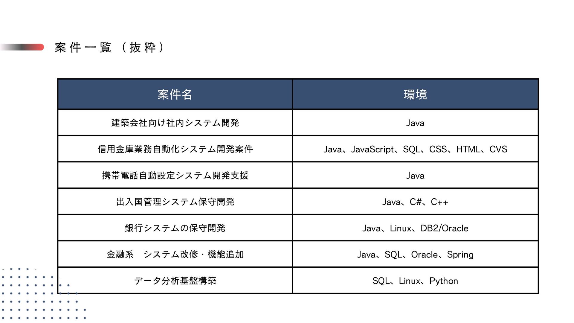 案件名 環境 建築会社向け社内システム開発 Java 信用金庫業務自動化システム開発案件 Java、JavaScript、SQL、CSS、HTML、CVS 携帯電話自動設定システム開発支援 Java 出入国管理システム保守開発 Java、C#、C++