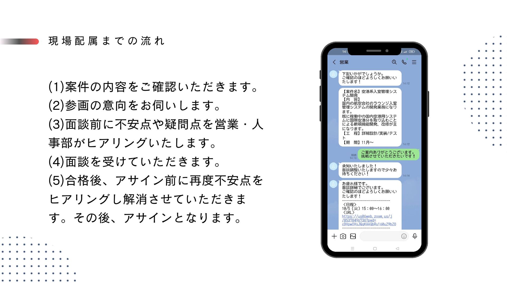(2)参画の意向をお伺いします。 (3)面談前に不安点や疑問点を営業・人 事部がヒアリングいたします。 (4)面談を受けていただきます。 (5)合格後、アサイン前に再度不安点を ヒアリングし解消させていただきま す。その後、アサインとなります。