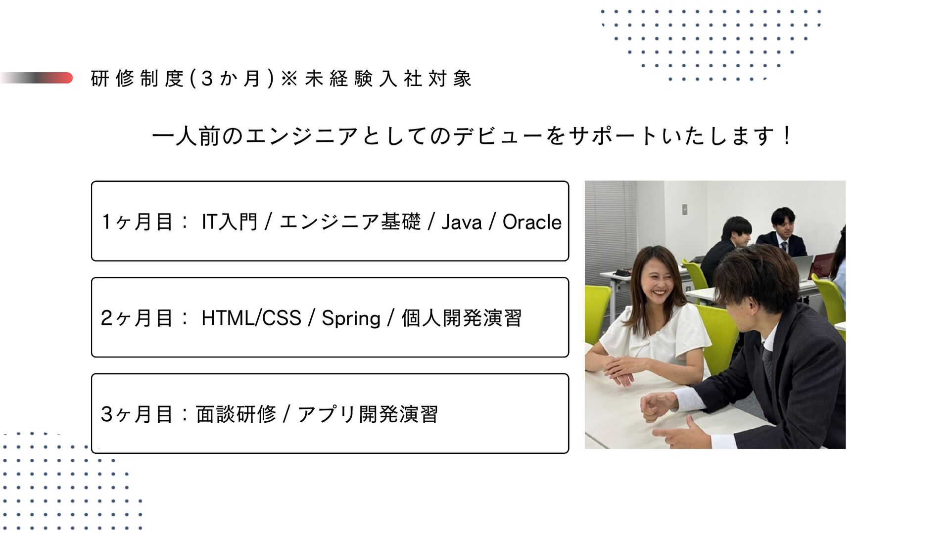 / Spring / 個人開発演習 3ヶ月目:面談研修 / アプリ開発演習 研 修 制 度 ( 3 か 月 ) ※ 未 経 験 入 社 対 象 一人前のエンジニアとしてのデビューをサポートいたします!