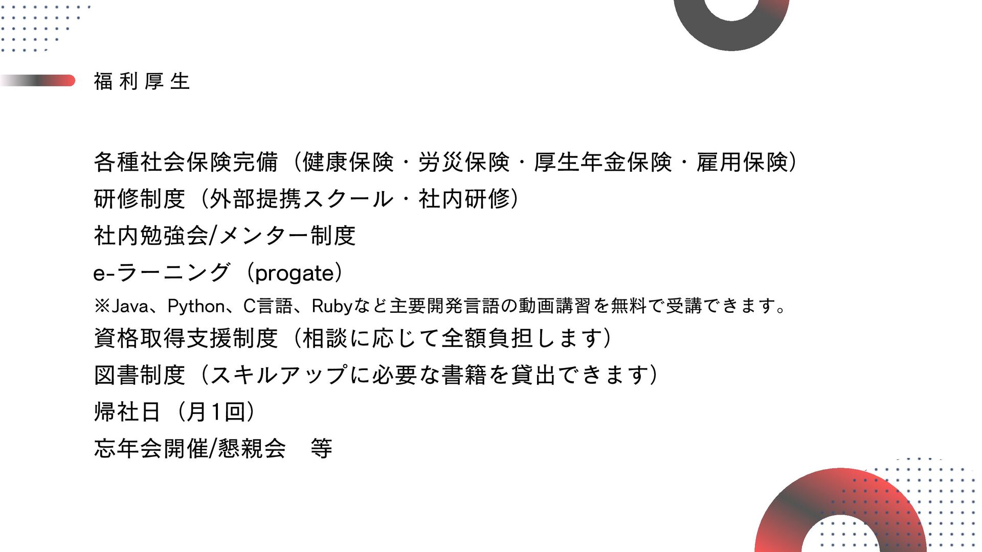 福 利 厚 生 各種社会保険完備(健康保険・労災保険・厚生年金保険・雇用保険) 研修制度(外部提携スクール・社内研修) 社内勉強会/メンター制度 e-ラーニング(progate) ※Java、Python、C言語、Rubyなど主要開発言語の動画講習を無料で受講できます。 資格取得支援制度(相談に応じて全額負担します)