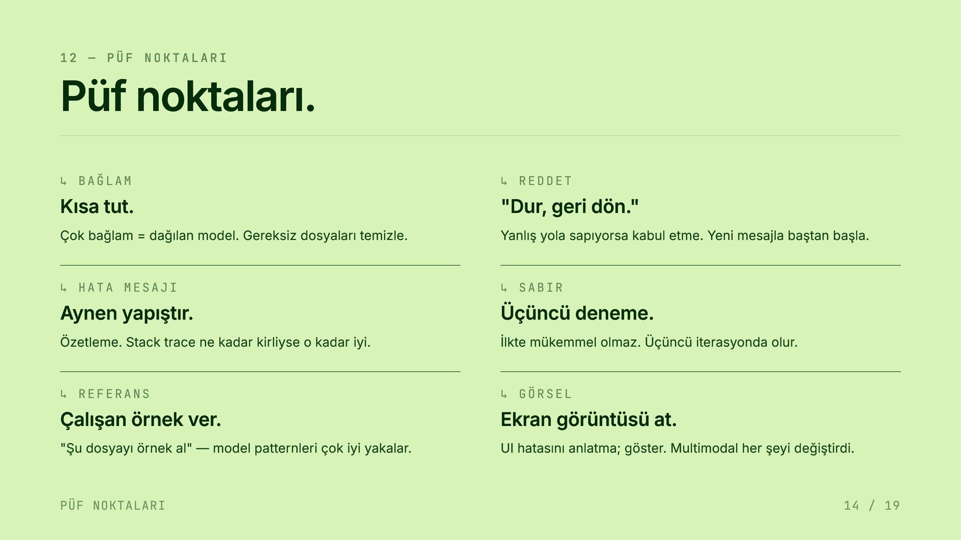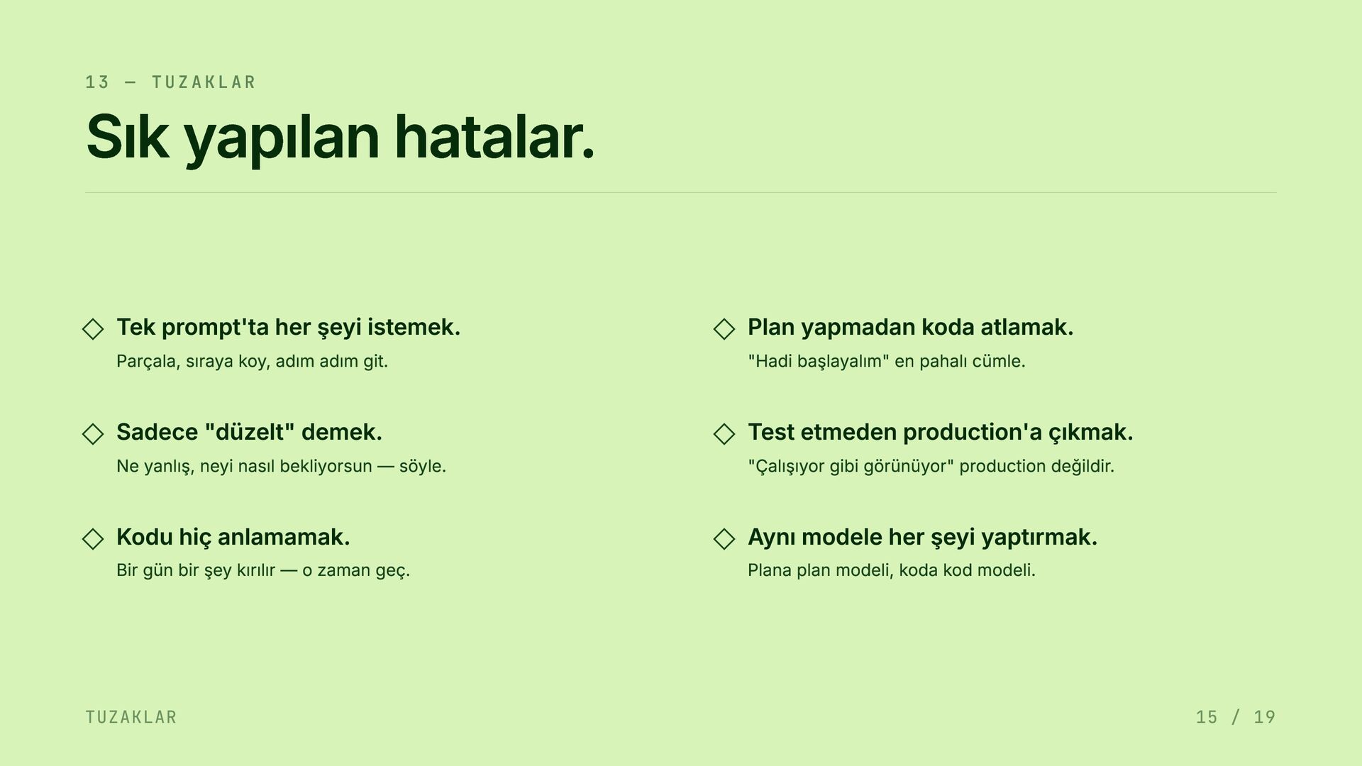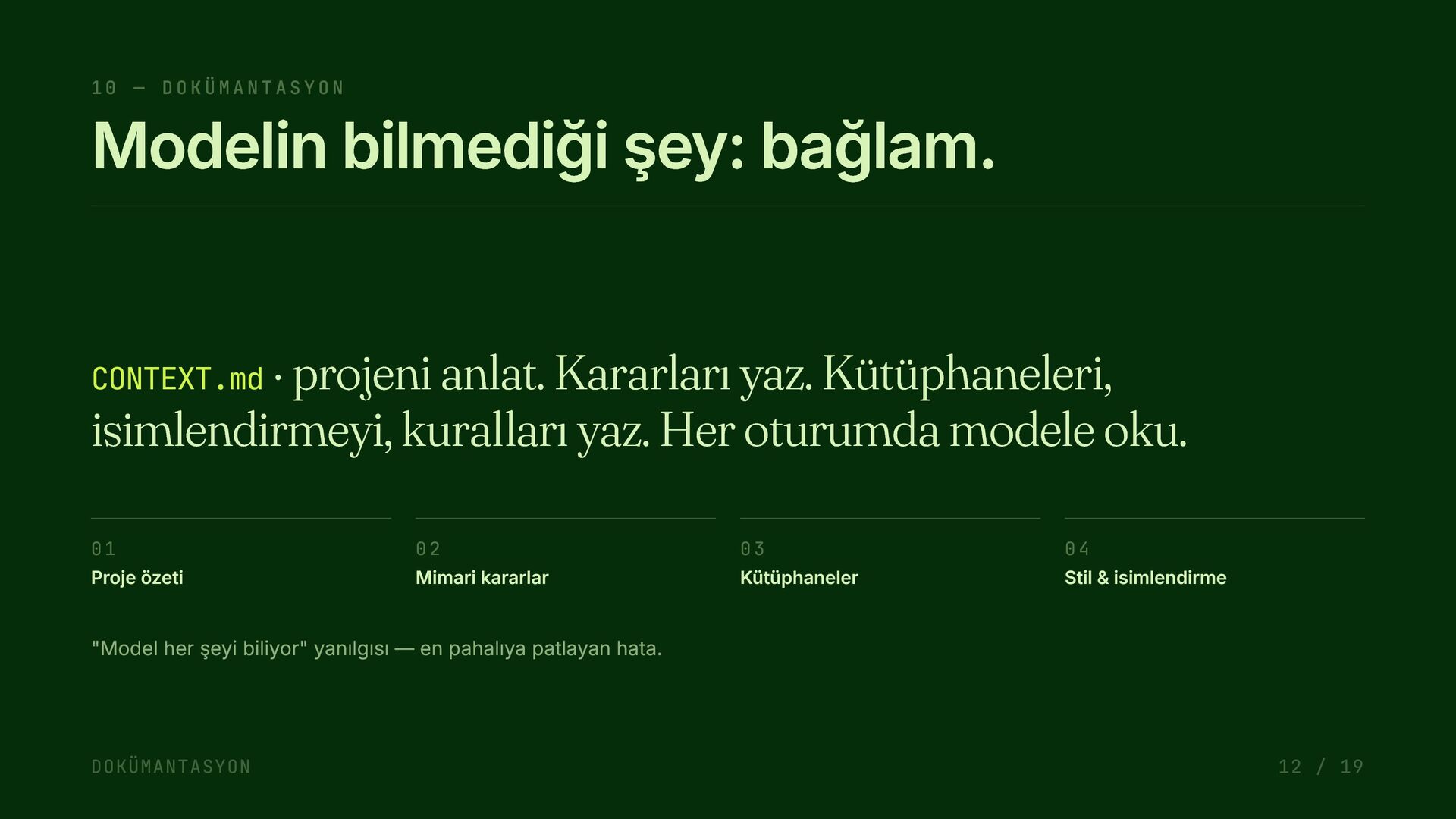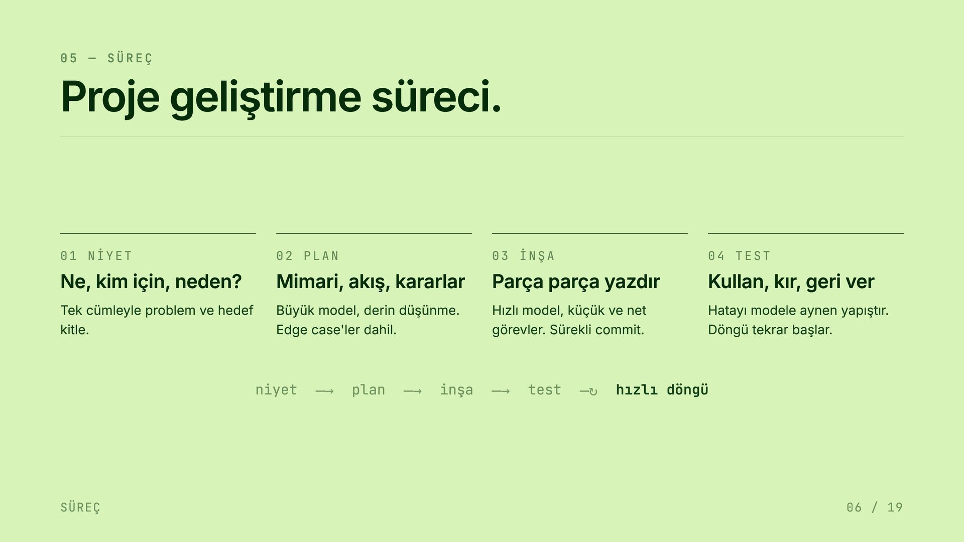 ve hedef kitle. Mimari, akış, kararlar Büyük model, derin düşünme. Edge case'ler dahil. Parça parça yazdır Hızlı model, küçük ve net görevler. Sürekli commit. Kullan, kır, geri ver Hatayı modele aynen yapıştır. Döngü tekrar başlar. hızlı döngü 0 5 — S Ü R E Ç 01 NİYET 02 PLAN 03 İNŞA 04 TEST niyet ─→ plan ─→ inşa ─→ test ─↻ SÜREÇ 06 / 19
