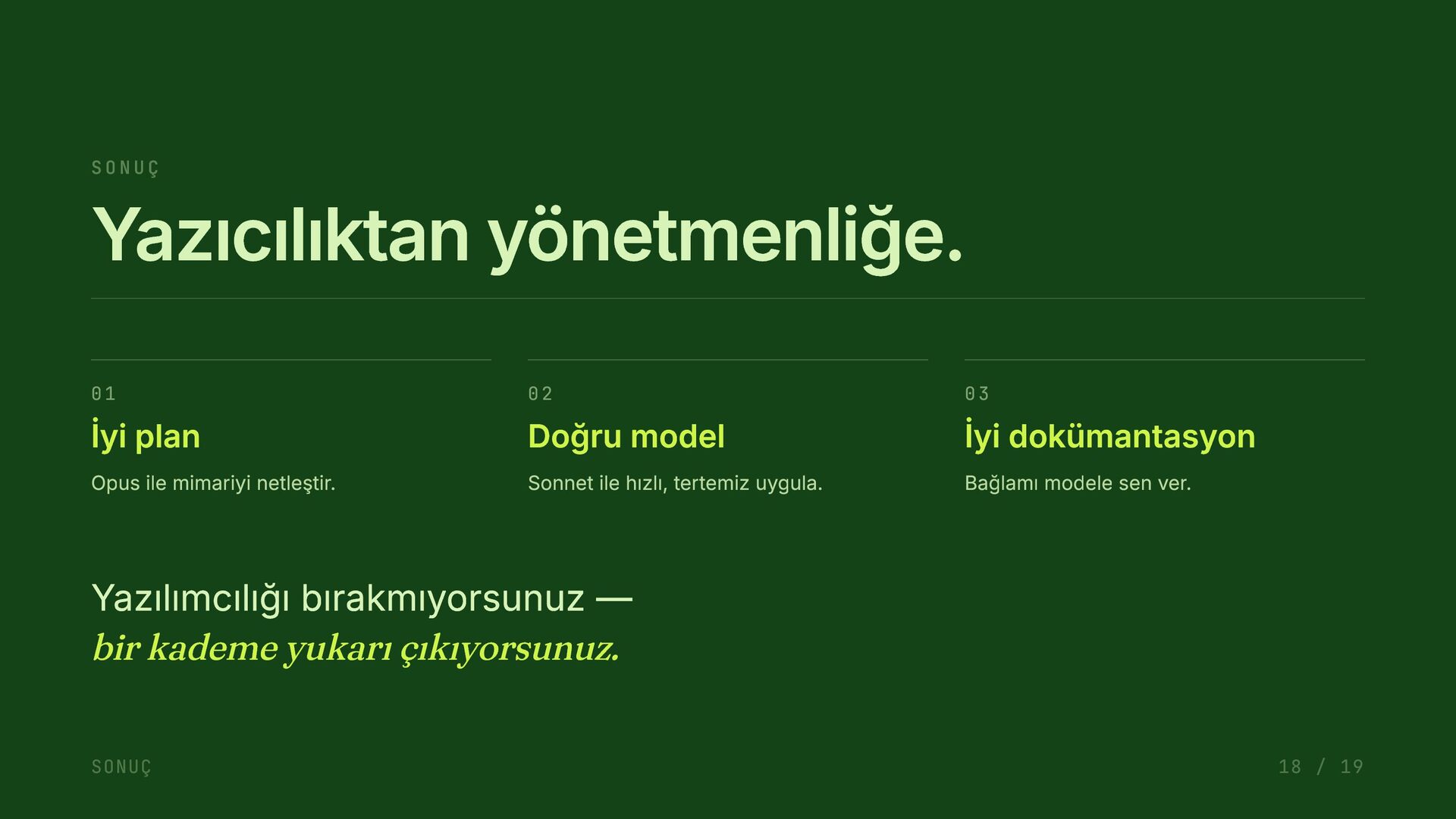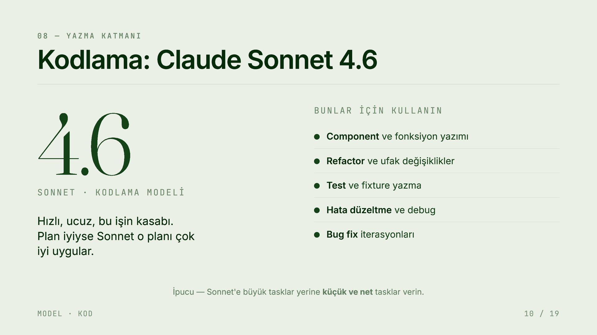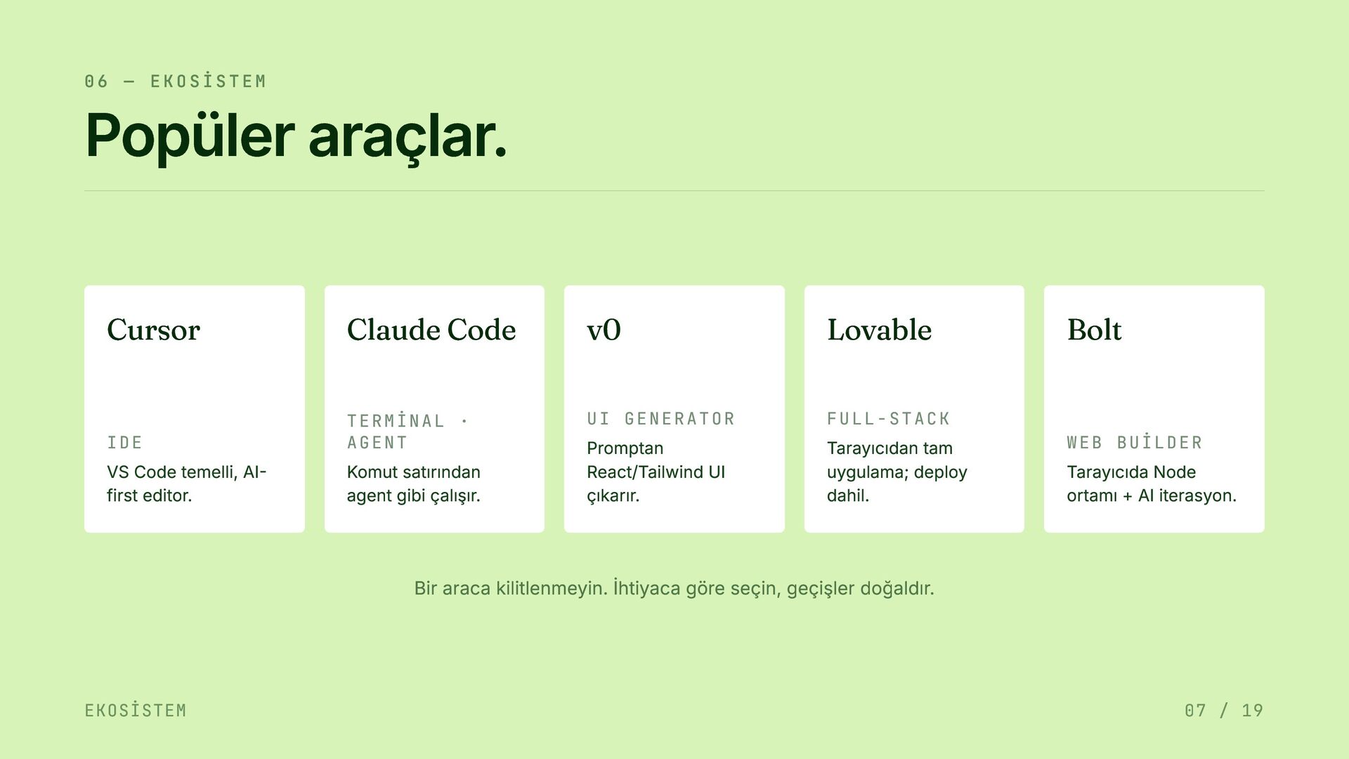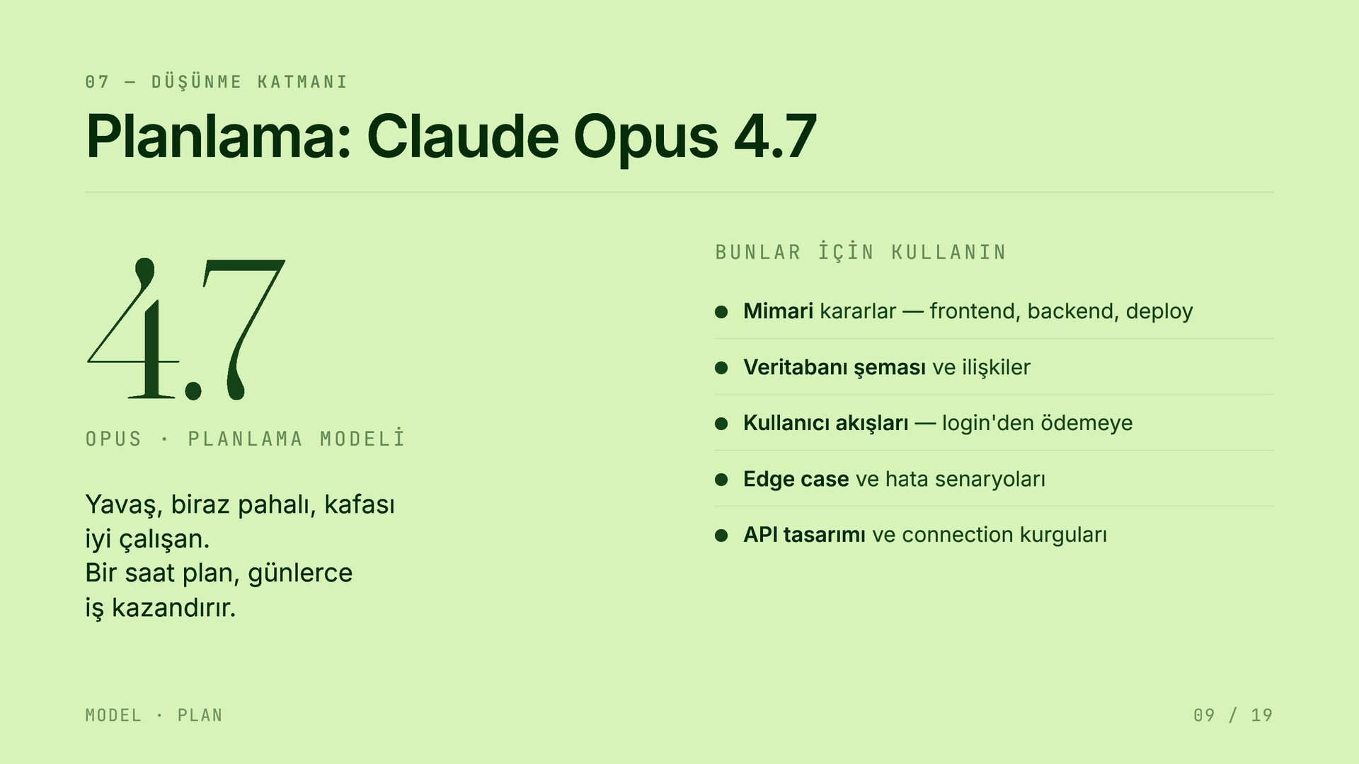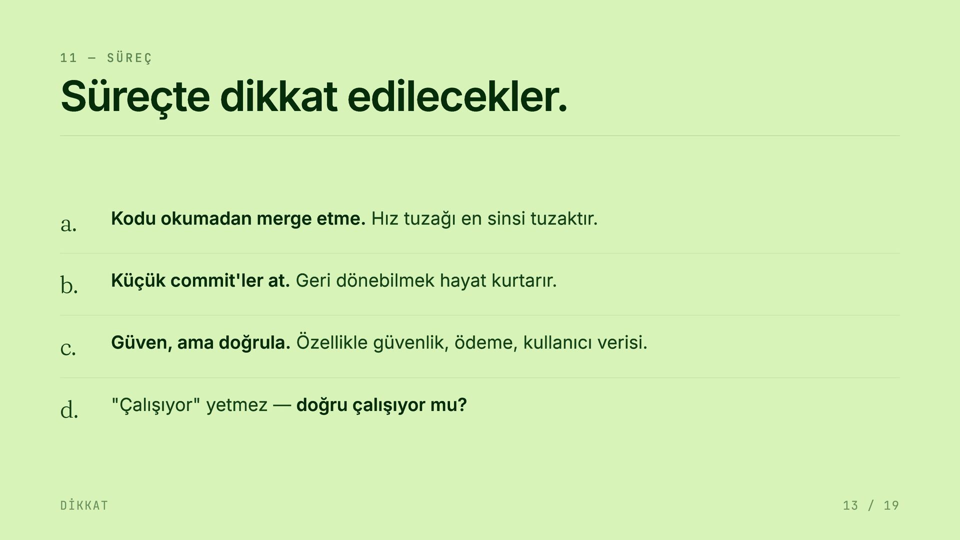 ve hedef kitle. Mimari, akış, kararlar Büyük model, derin düşünme. Edge case'ler dahil. Parça parça yazdır Hızlı model, küçük ve net görevler. Sürekli commit. Kullan, kır, geri ver Hatayı modele aynen yapıştır. Döngü tekrar başlar. hızlı döngü 0 5 — S Ü R E Ç 01 NİYET 02 PLAN 03 İNŞA 04 TEST niyet ─→ plan ─→ inşa ─→ test ─↻ SÜREÇ 06 / 19