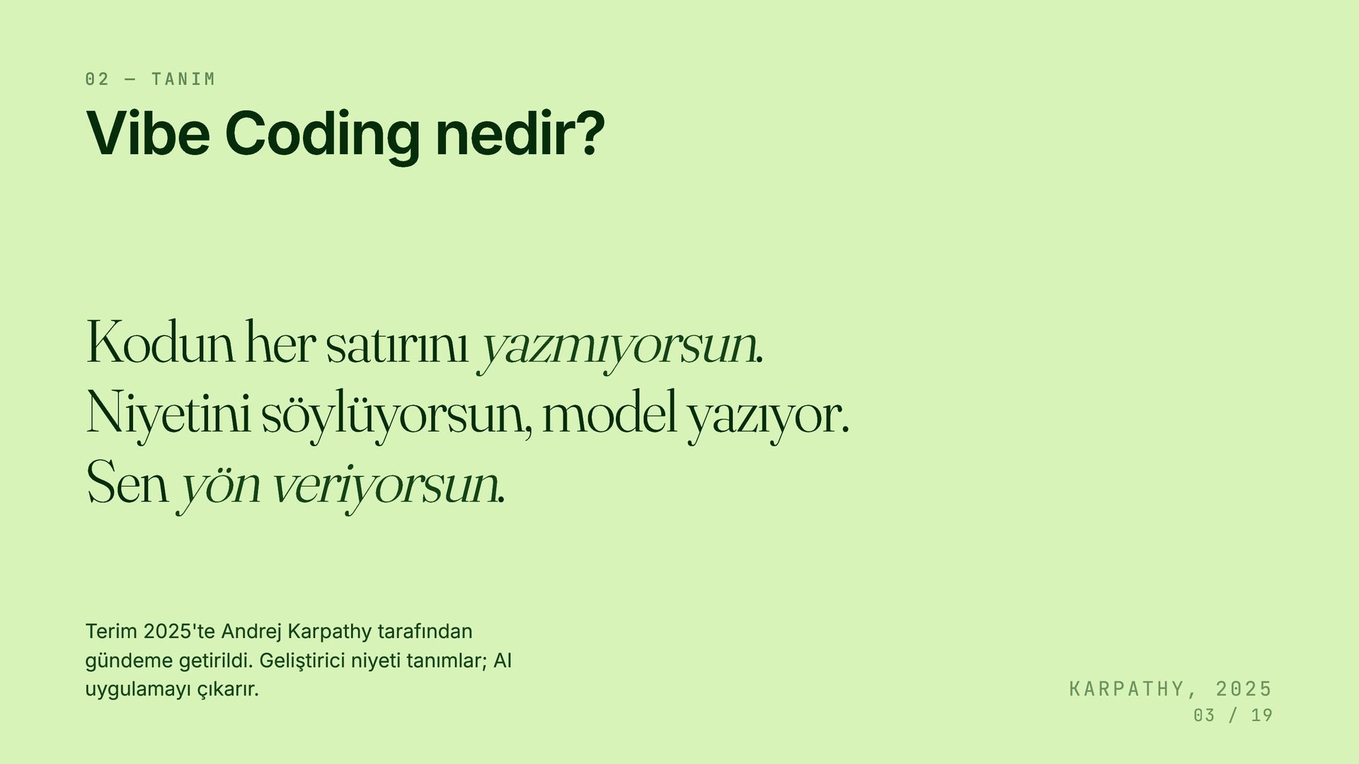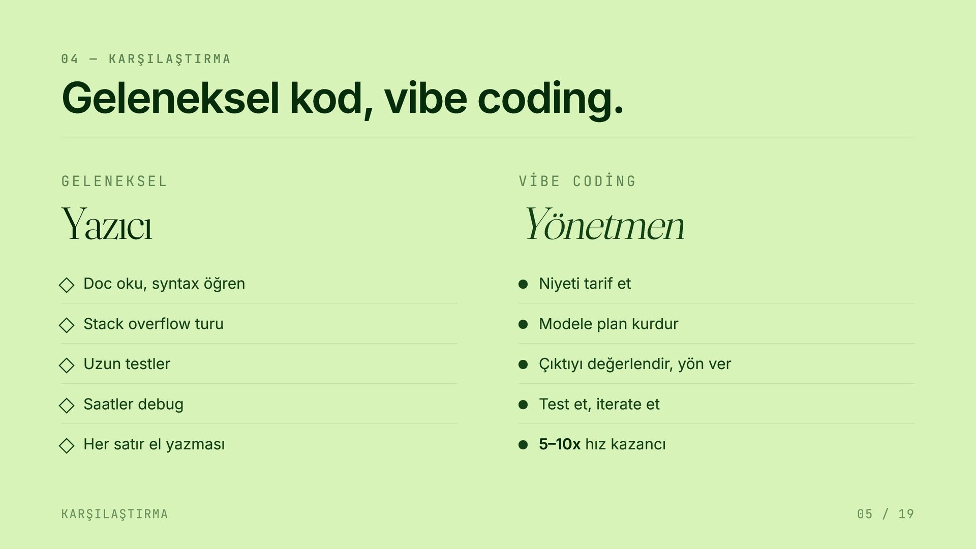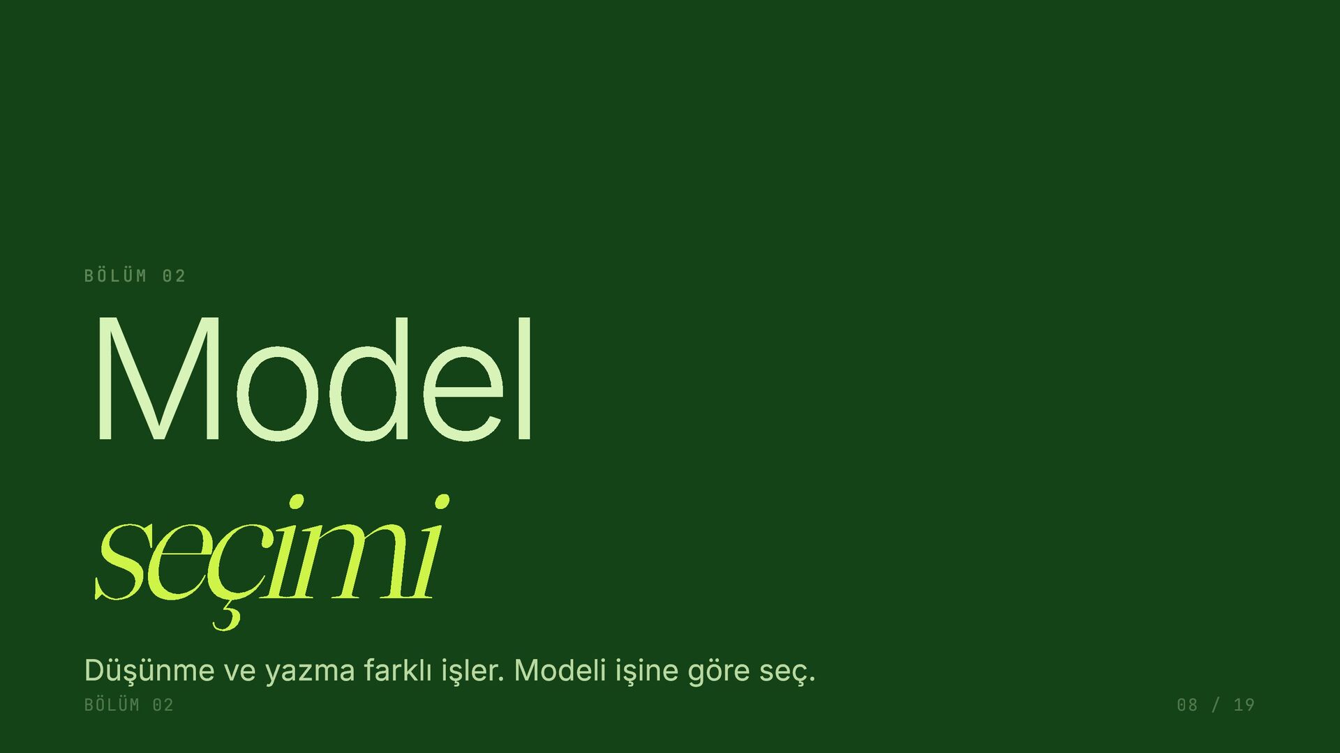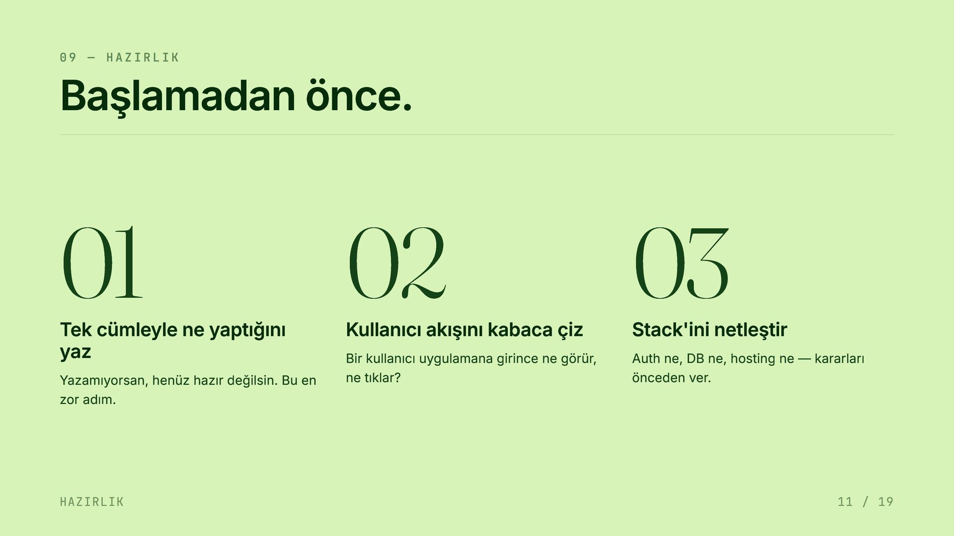 ve hedef kitle. Mimari, akış, kararlar Büyük model, derin düşünme. Edge case'ler dahil. Parça parça yazdır Hızlı model, küçük ve net görevler. Sürekli commit. Kullan, kır, geri ver Hatayı modele aynen yapıştır. Döngü tekrar başlar. hızlı döngü 0 5 — S Ü R E Ç 01 NİYET 02 PLAN 03 İNŞA 04 TEST niyet ─→ plan ─→ inşa ─→ test ─↻ SÜREÇ 06 / 19
