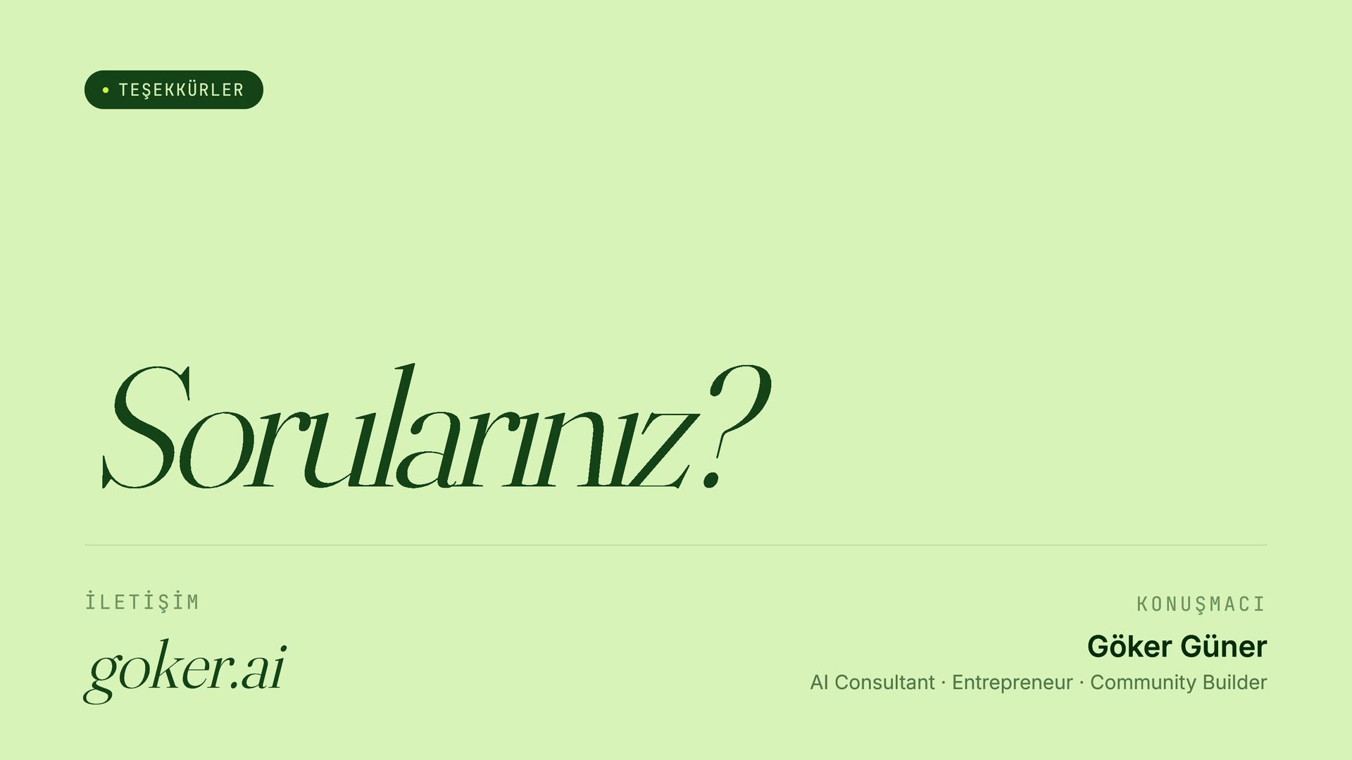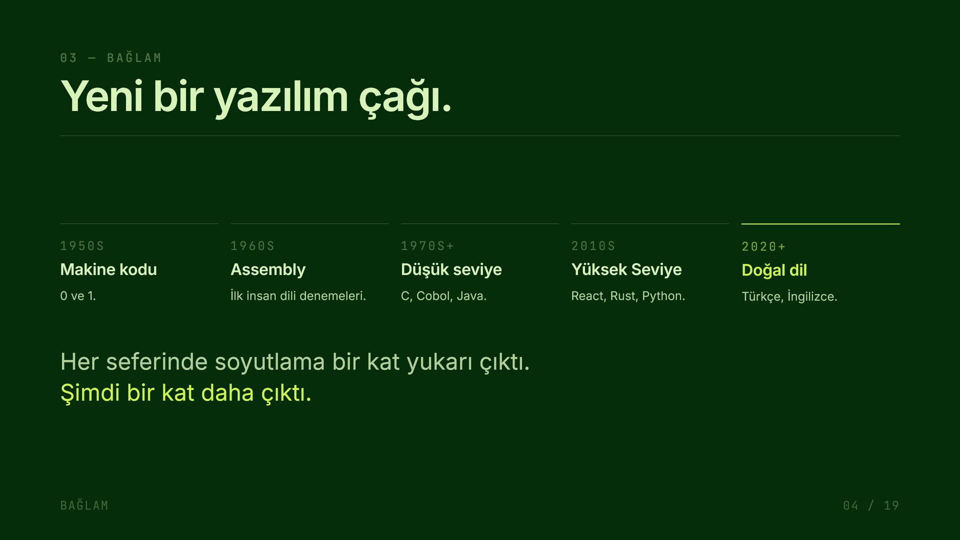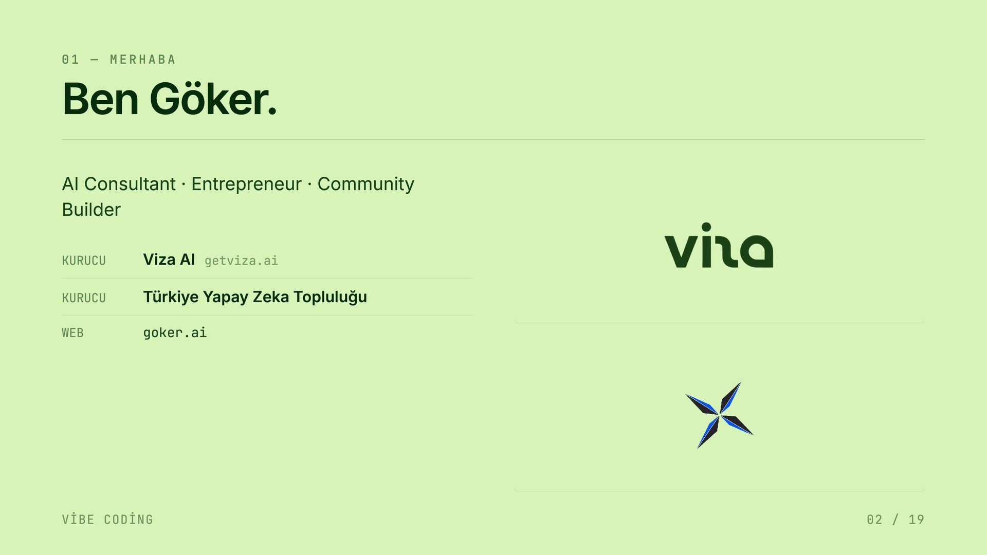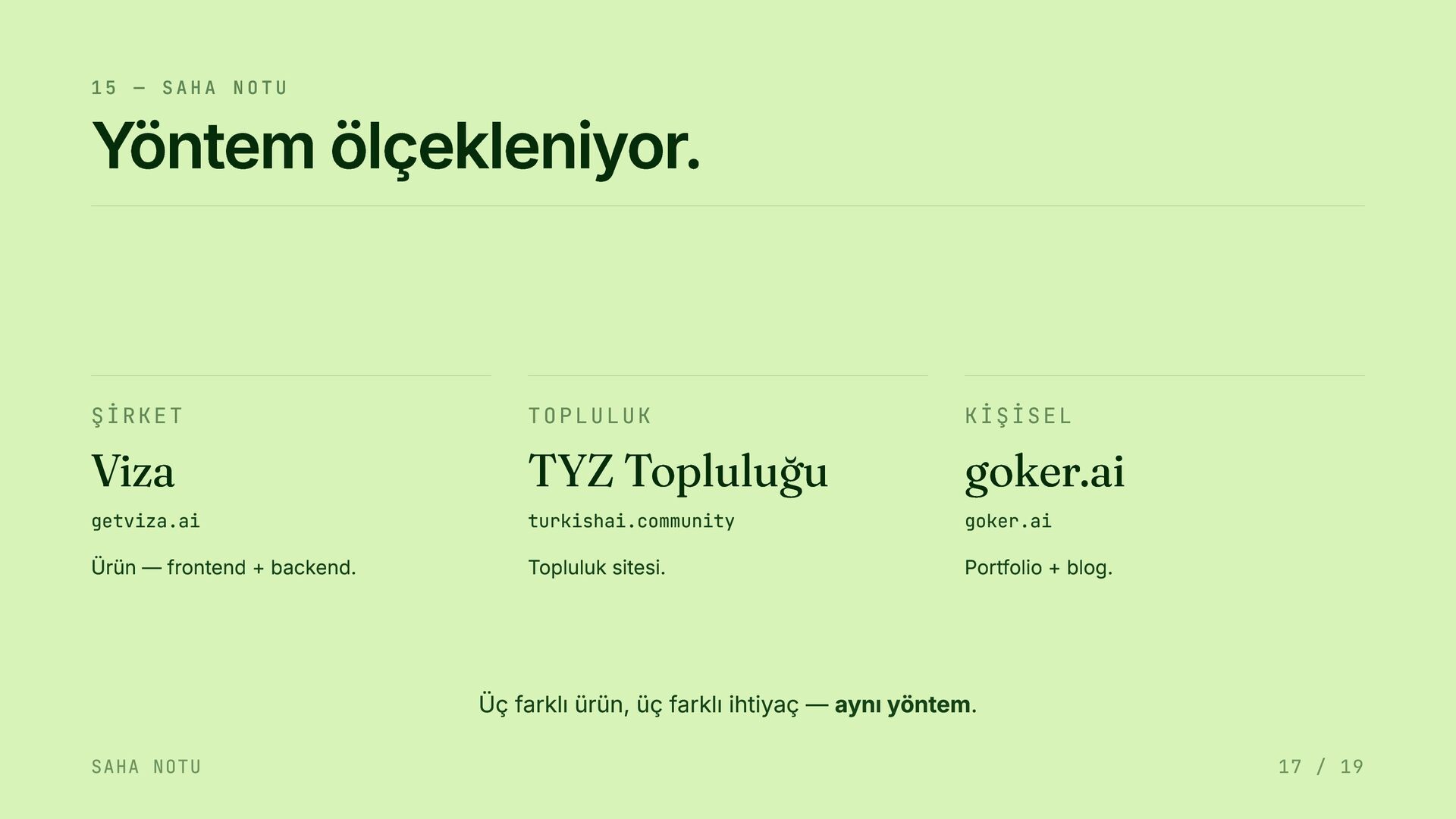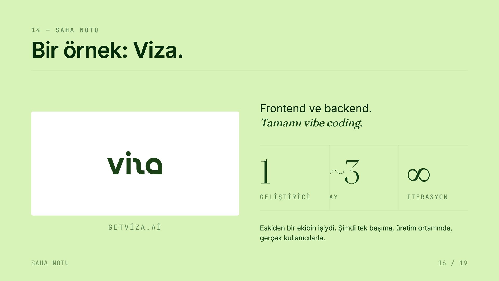 ve hedef kitle. Mimari, akış, kararlar Büyük model, derin düşünme. Edge case'ler dahil. Parça parça yazdır Hızlı model, küçük ve net görevler. Sürekli commit. Kullan, kır, geri ver Hatayı modele aynen yapıştır. Döngü tekrar başlar. hızlı döngü 0 5 — S Ü R E Ç 01 NİYET 02 PLAN 03 İNŞA 04 TEST niyet ─→ plan ─→ inşa ─→ test ─↻ SÜREÇ 06 / 19