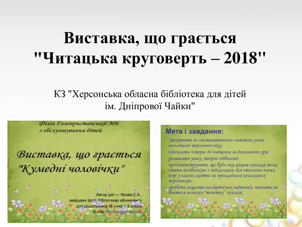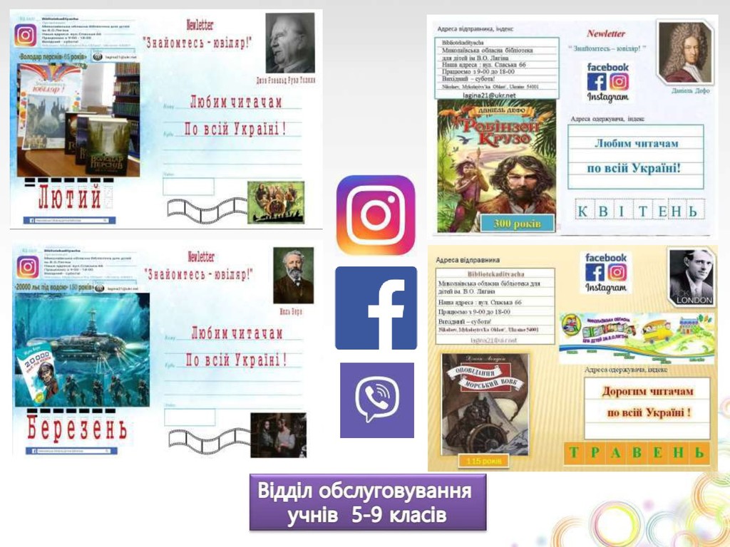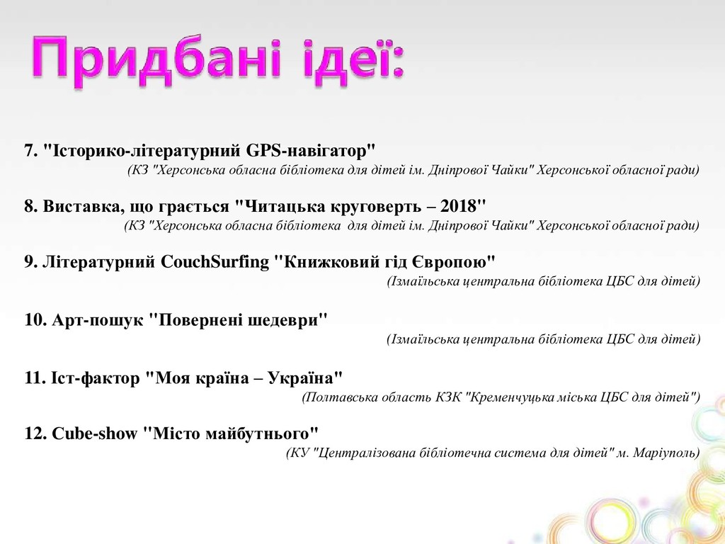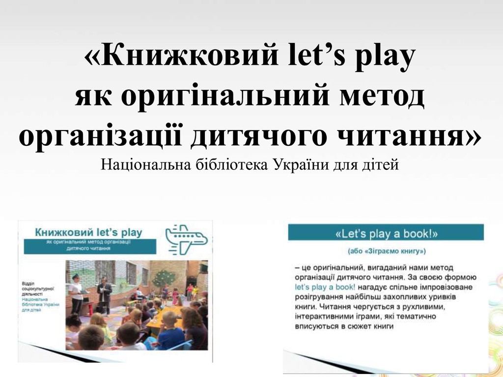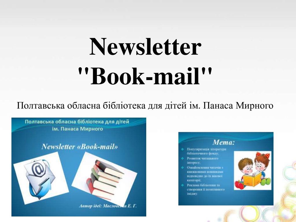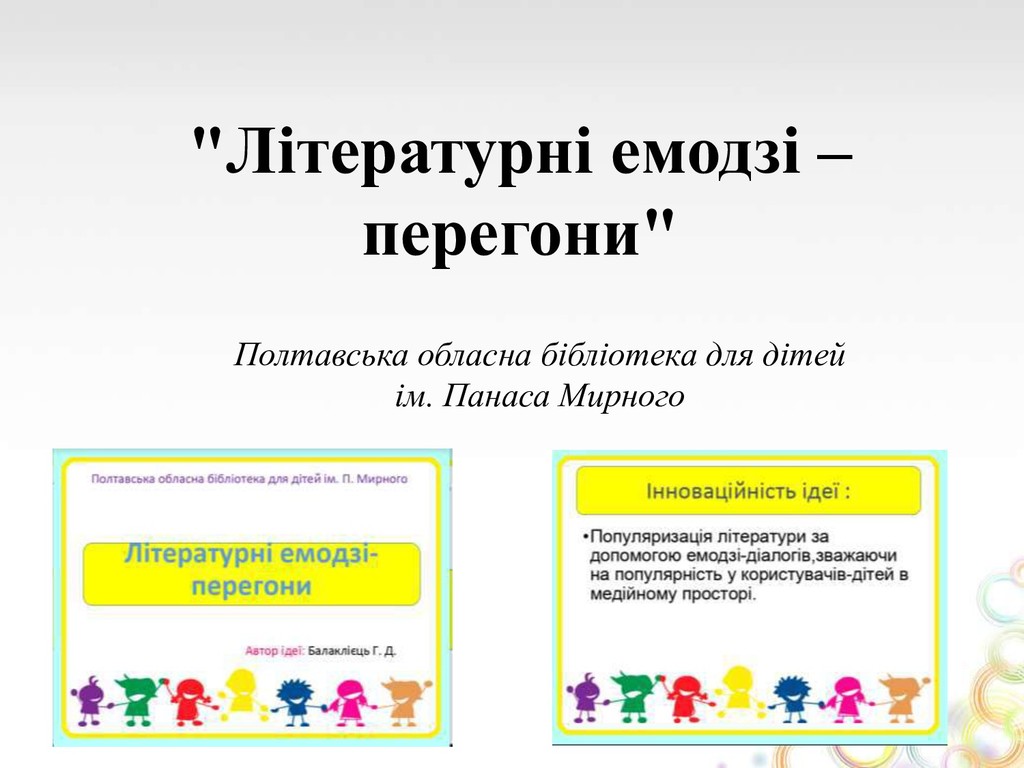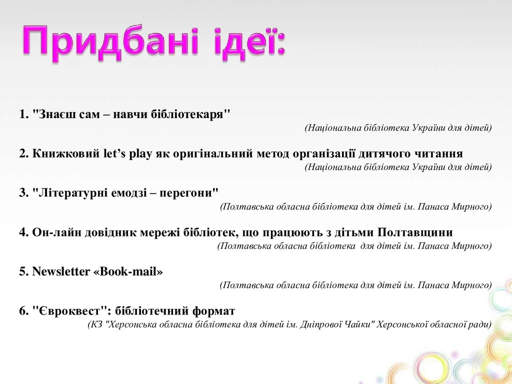 дітей) 2. Книжковий let’s play як оригінальний метод організації дитячого читання (Національна бібліотека України для дітей) 3. "Літературні емодзі – перегони" (Полтавська обласна бібліотека для дітей ім. Панаса Мирного) 4. Он-лайн довідник мережі бібліотек, що працюють з дітьми Полтавщини (Полтавська обласна бібліотека для дітей ім. Панаса Мирного) 5. Newsletter «Book-mail» (Полтавська обласна бібліотека для дітей ім. Панаса Мирного) 6. "Євроквест": бібліотечний формат (КЗ "Херсонська обласна бібліотека для дітей ім. Дніпрової Чайки" Херсонської обласної ради)