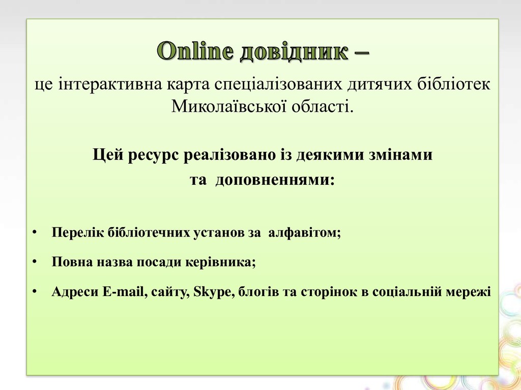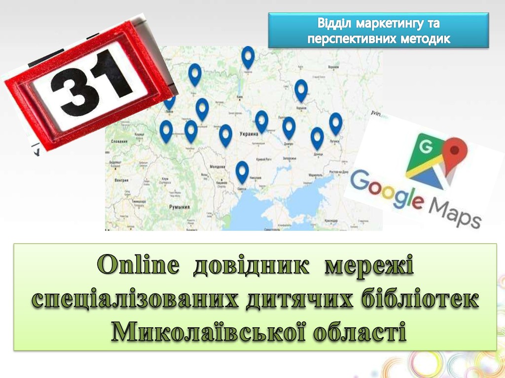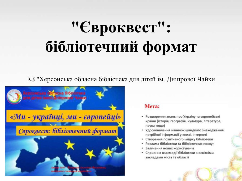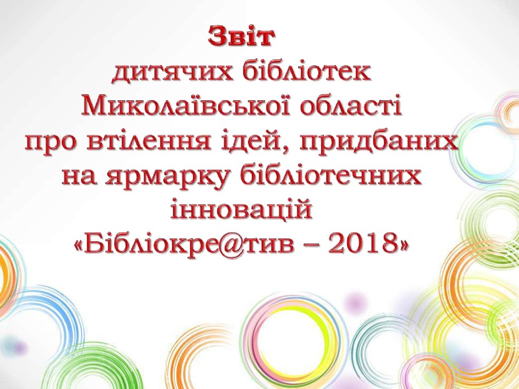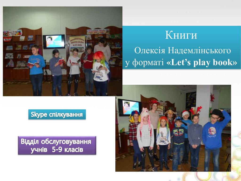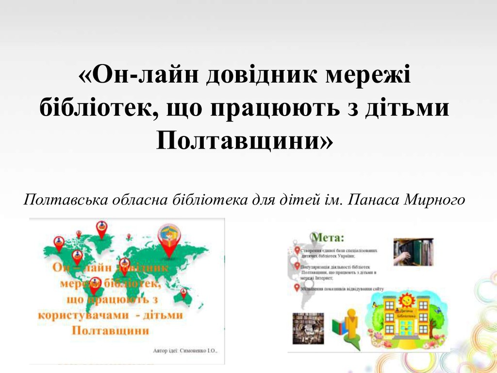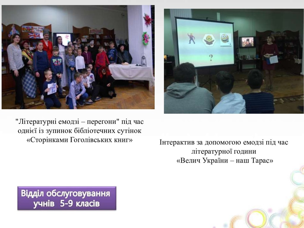 дітей) 2. Книжковий let’s play як оригінальний метод організації дитячого читання (Національна бібліотека України для дітей) 3. "Літературні емодзі – перегони" (Полтавська обласна бібліотека для дітей ім. Панаса Мирного) 4. Он-лайн довідник мережі бібліотек, що працюють з дітьми Полтавщини (Полтавська обласна бібліотека для дітей ім. Панаса Мирного) 5. Newsletter «Book-mail» (Полтавська обласна бібліотека для дітей ім. Панаса Мирного) 6. "Євроквест": бібліотечний формат (КЗ "Херсонська обласна бібліотека для дітей ім. Дніпрової Чайки" Херсонської обласної ради)