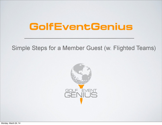 are they playing (Add the rounds to the calendar) ✓ WHERE are they playing (Set the course and tees for the players) ✓ WHAT are they playing (Create the tournaments to be played) The following simple steps will help you accomplish these tasks and send you well on your way to be a Genius. In order to successfully use Golf Genius to manage an event, you will need to know: Monday, March 24, 14