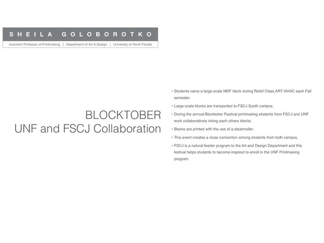 [email protected]> Subject: Blocktober banners Dear Dr. Murphy and Dan, Our printmaking students will hang the banners from Blocktober this coming Thursday 12/3 around 3pm. As discussed with Dan, banners will hang from the bridge (Fine arts - garage 44). Banner will remain in display during Open House, Saturday 12/5 and removed at the end of the day. I will be at our printmaking studio during the Open House and will display a powerpoint of Blocktober carving and pringng process. Looking forward to all, Best, Sheila Sheila Goloborotko Assistant Professor, Printmaking