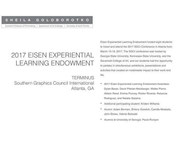Atlanta, GA Eisen Experiential Learning Endowment funded eight students to travel and attend the 2017 SGCI Conference in Atlanta from March 15-18, 2017. The SGCI conference was hosted by Georgia State University, Kennesaw State University, and the Savannah College of Art, and our students had the opportunity to partake in simultaneous exhibitions, presentations and activities that created an inestimable impact to their work and life. • 2017 Eisen Experiential Learning Endowment Awardees: Dylan Bauer, Devin Phelan-Weisberger, Walter Pierre, Allison Reed, Emma Poovey, Ricder Ricardo, Rebecca Rodriguez, and Natalie Sassine, • Additional participating student: Kirsten Williams • Alumni: Adam Berman, Britany Gorelick, Camille Modesto, John Stowe, Valerie Belzeski • Alumna at University of Gerogia: Paula Runyon