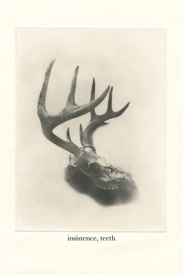 of Levi’s varnish, of hardening, or sticky materiality. Being a writer (and a dsylexic), I cling to moments in Levi’s meditations that are textual. I hover around a typo and a mispelling. The first is in the chapter “Chromium”; the later is in the more famous chapter, “Vanadium.” It is 1946. Levi, released from Auschwitz just three months earlier, finds work at a factory. He is shown a pile of livered paint (“thousands of square blocks of orange”). His task is to find the exact chemical mistake (imbalance between the basic chromate and alkyd resin) that ruins batch after batch of paint. A typo, “23 drops,” that should have been “2 or 3 drops” is repeated for years. Because it is wartime? Because no one dares to question or change the formula? the Fascists? Bureaucratic insistence + fear + laziness = a hyperobject? Chemist Levi finds a fix: add salt (ammonium cloride). Voilà the gelatinous glop is reclaimed. Hence forth, the additive becomes standard practice and is instutionalized and maintained even after it proves “absurd” and detrimental for later chromate-based anti-rust paints. Regiment + recipe + rigidity = absurdity. This bears true in one’s politics, one’s body, one’s habitat. Ideological insistence is dangerous. Later, in the chapter entitled “Vanadium,” a spelling habit (using “pt” instead of “phth” in words like “naphthenate” or “beta-Naphthylamin”) marks a man. In a post-war communicate about a varnish that brutally hardens, Levi recognizes his overseerer, his opressor. In an unsent letter, Levi asserts: “I declared myself ready to forgive my enemies, and perhaps even to love them, but only when they showed certains signs of repentance, that is, when they ceased being enemies. In the opposite case, that of the enemy who remains an enemy, who perserveres in his desire to inflict suffering, it is ceratin one must not forgive him: one can try to salvage him, one can (one must!) discuss with him, but it is our duty to judge him, not to forgive him.” What do these stories show me Goloborotko’s Dear Deer series? I hover between interations: the bones, the skull-n-antlers before Goloborotko adds senescence by layering saffron color over a sepia tone. She adds